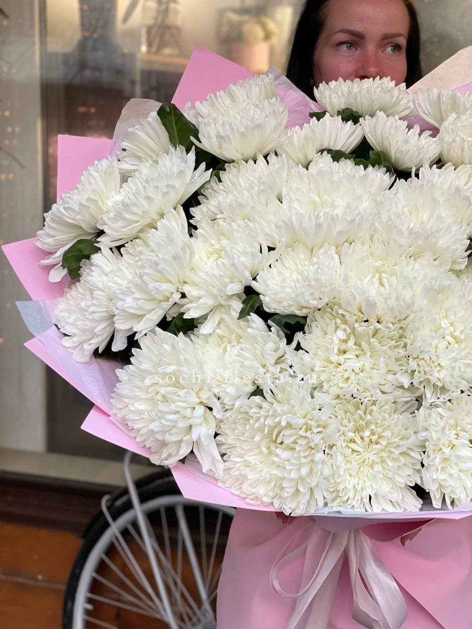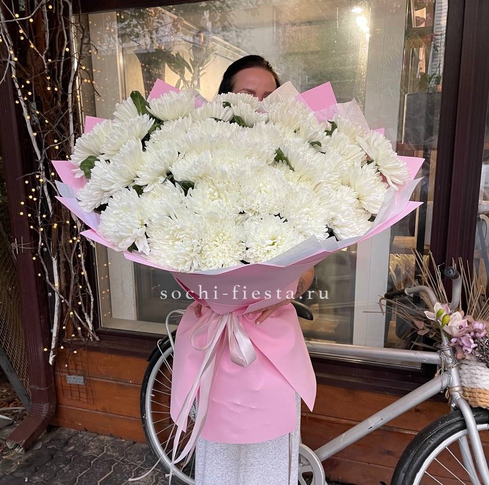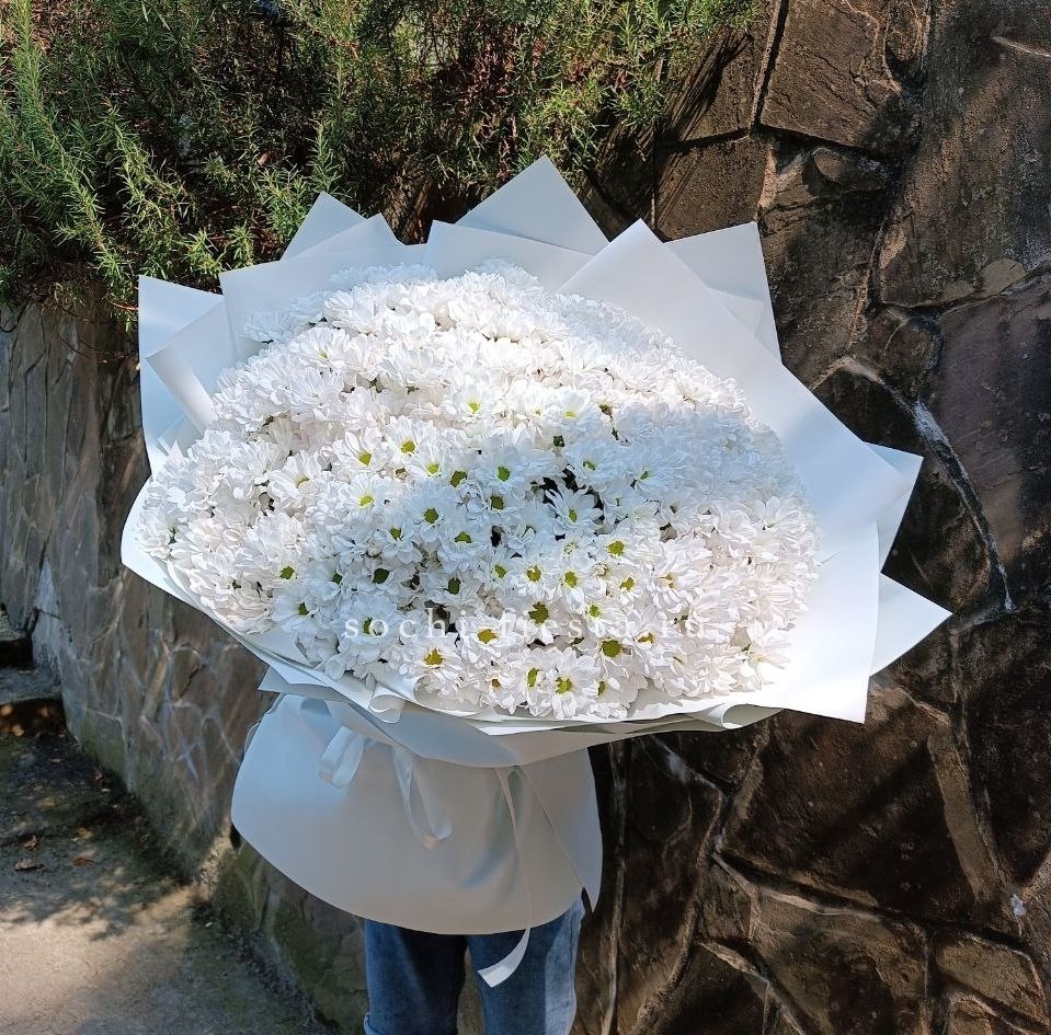 Пять кустовых хризантем собраны в лаконичный букет с мягким обрамлением. Пышные соцветия создают воздушный объем и заполняют пространство легкостью.