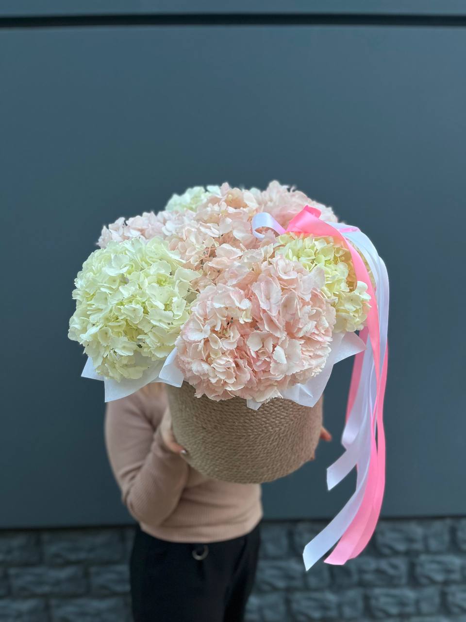 Семь пышных шапок гортензий собраны в природном джутовом кашпо. Плотные соцветия создают облачную текстуру, где каждый бутон дополняет общий объем. Композиция готова к размещению на столе или комоде без дополнительных усилий.