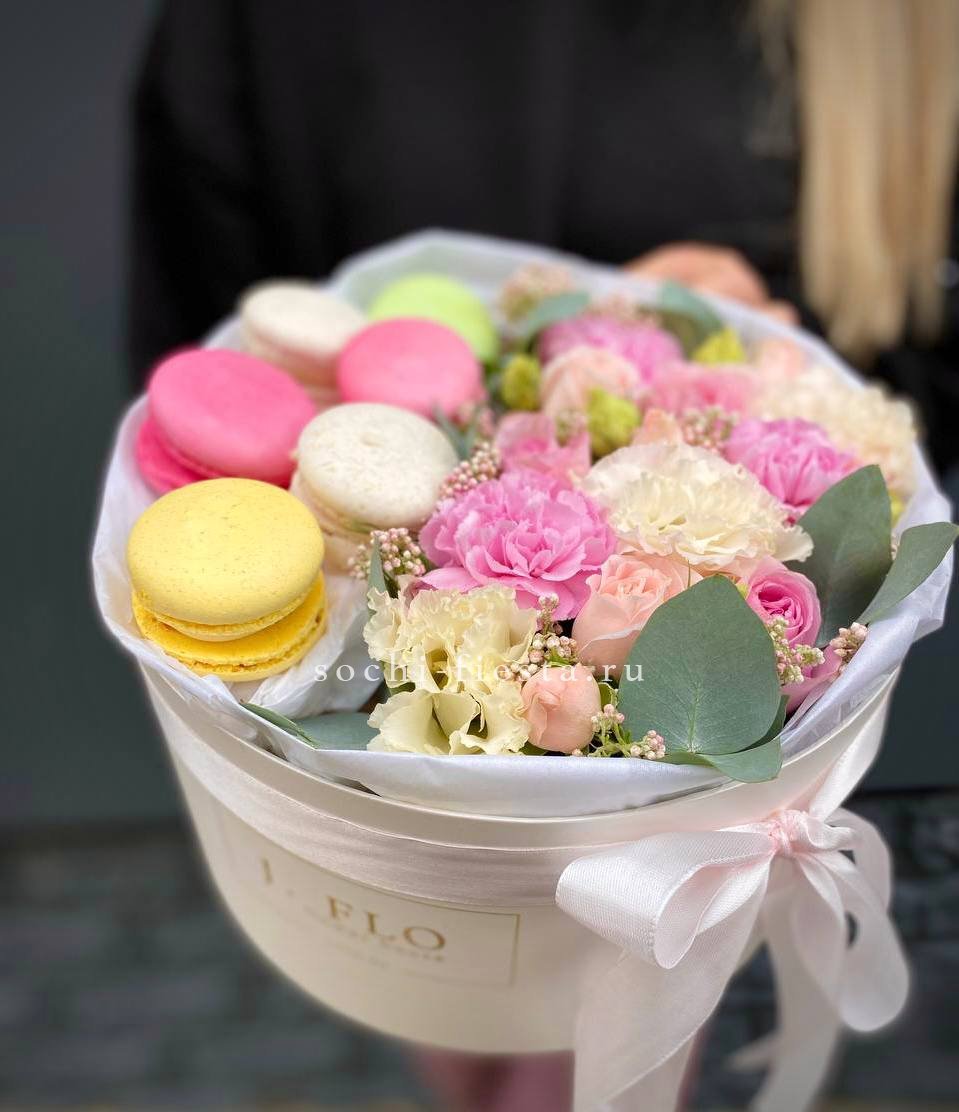 Пудровые розы и кустовые соцветия собраны с диантусами и озотамнусом в округлую форму. Шесть макаронс завершают композицию и создают ощущение домашнего уюта.