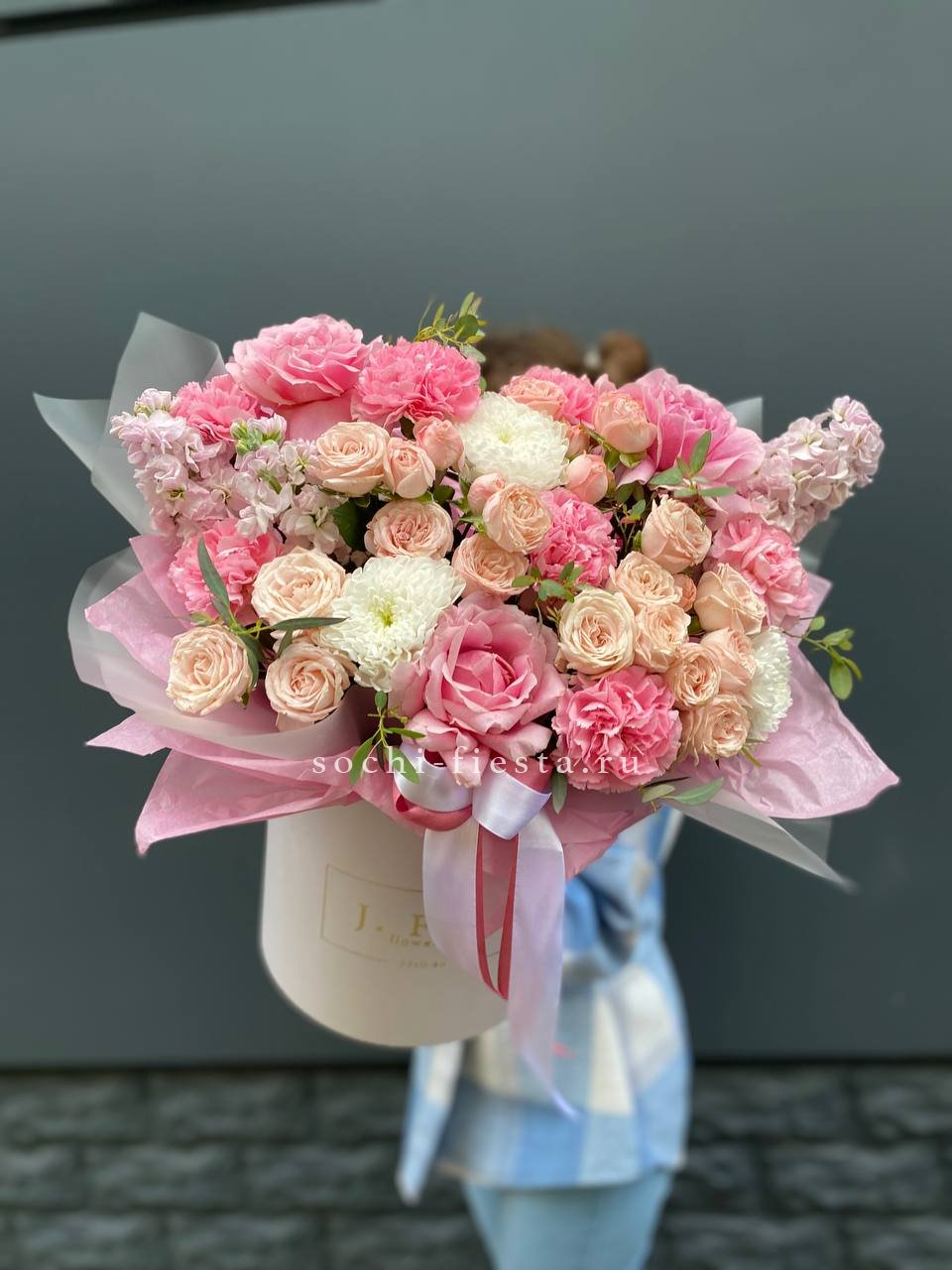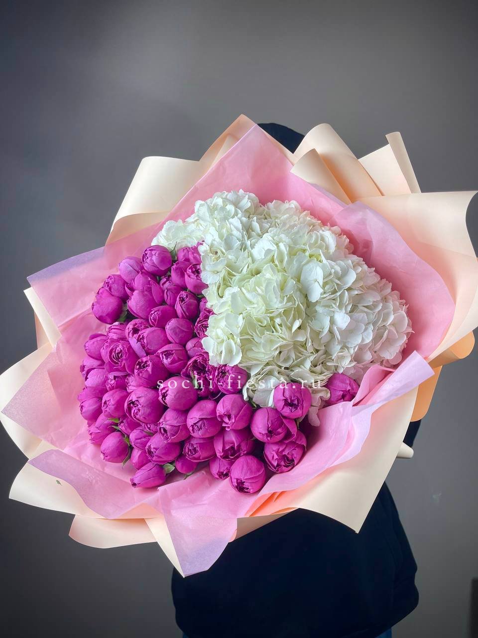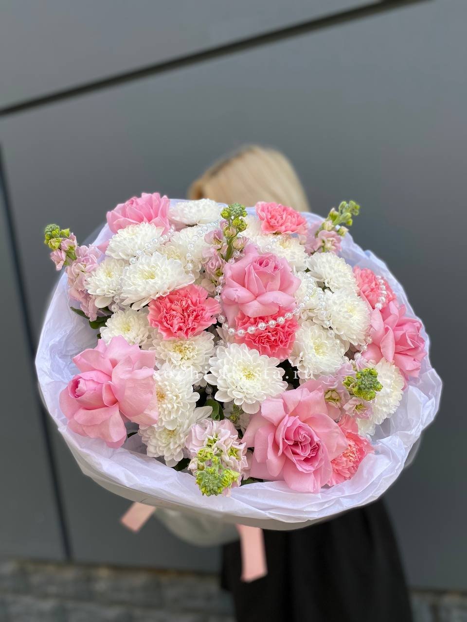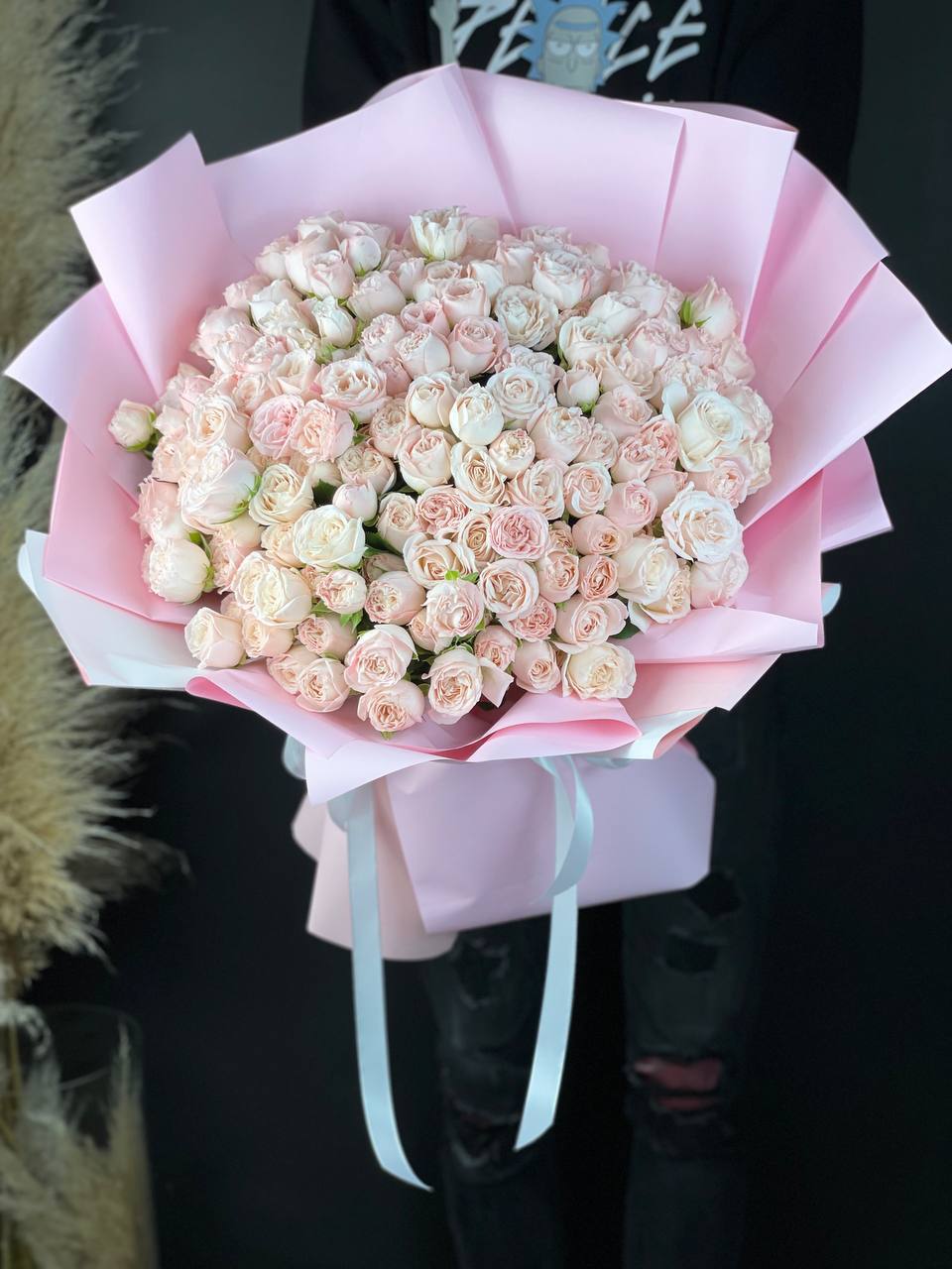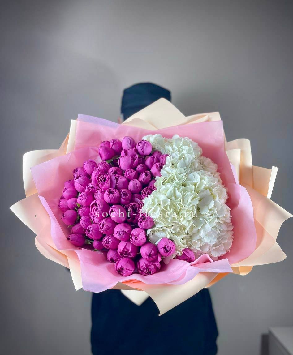 гортензия, хлопок, бомбастик, белая роза, маттиола- может меняться от сезона на диантус, ковыль, упаковка.