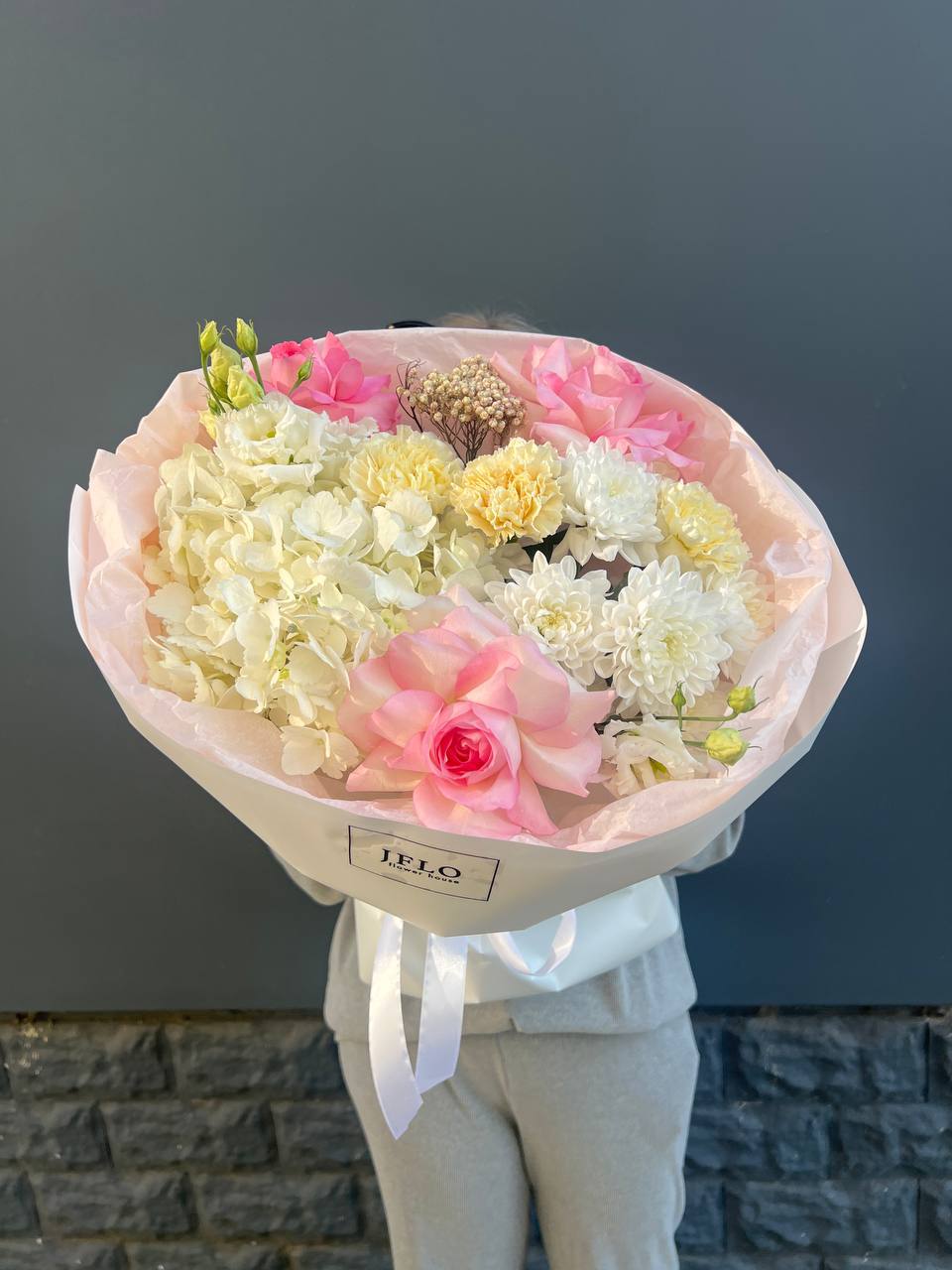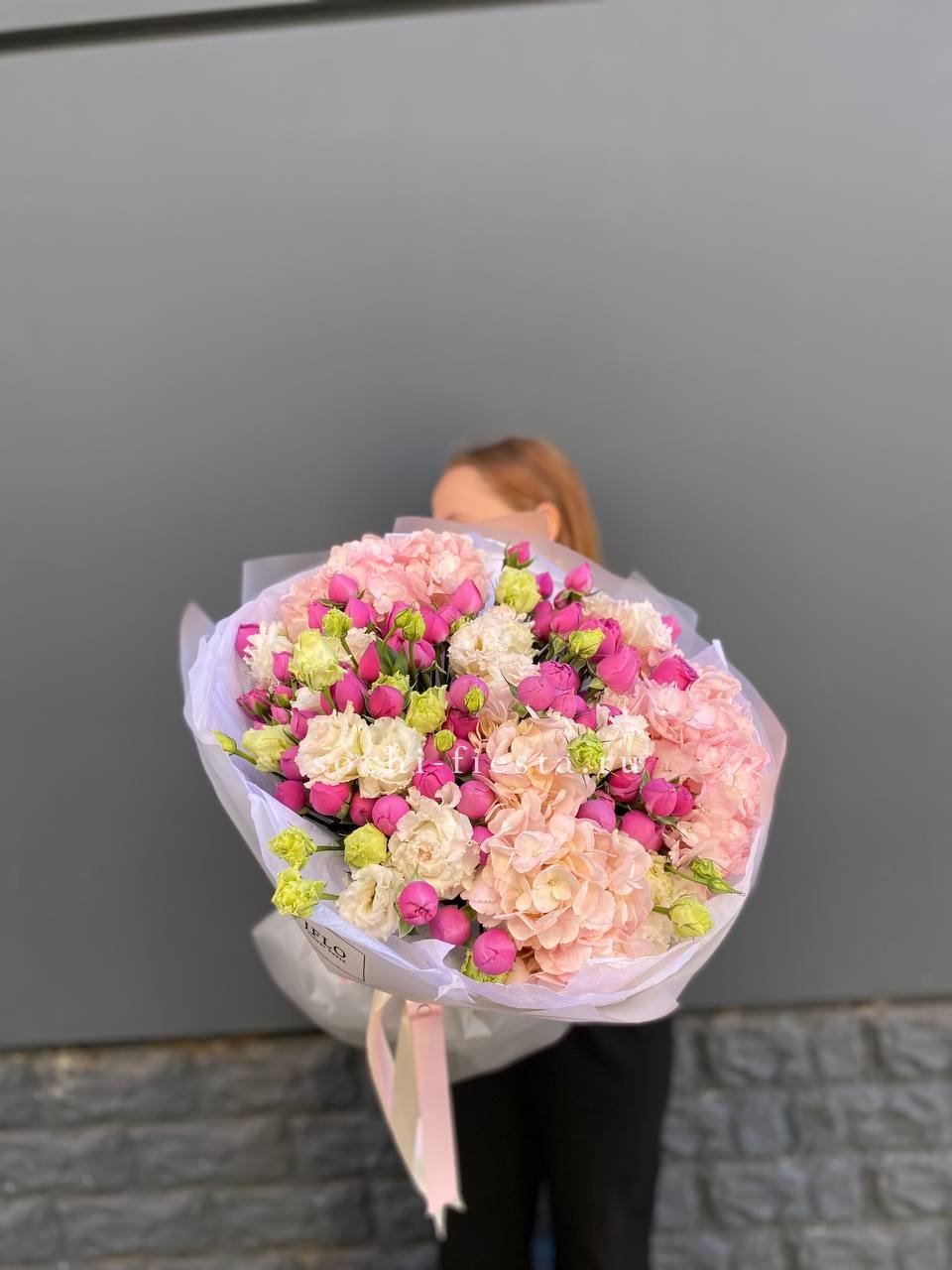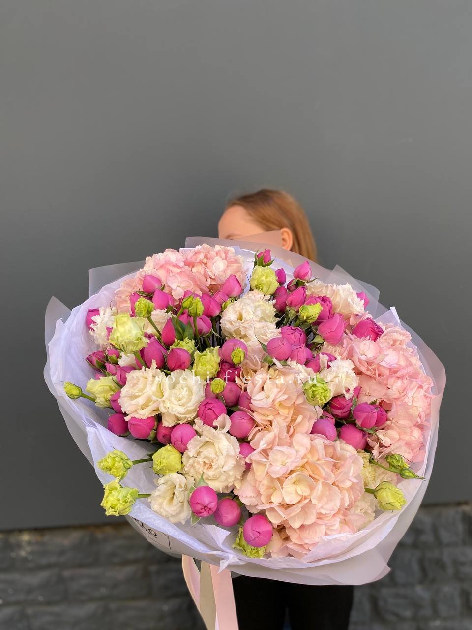 Мисти Баблс и гортензии в воздушной упаковке дарят ощущение свежести раннего утра. Лёгкая структура букета сохраняет форму и долго радует глаз.