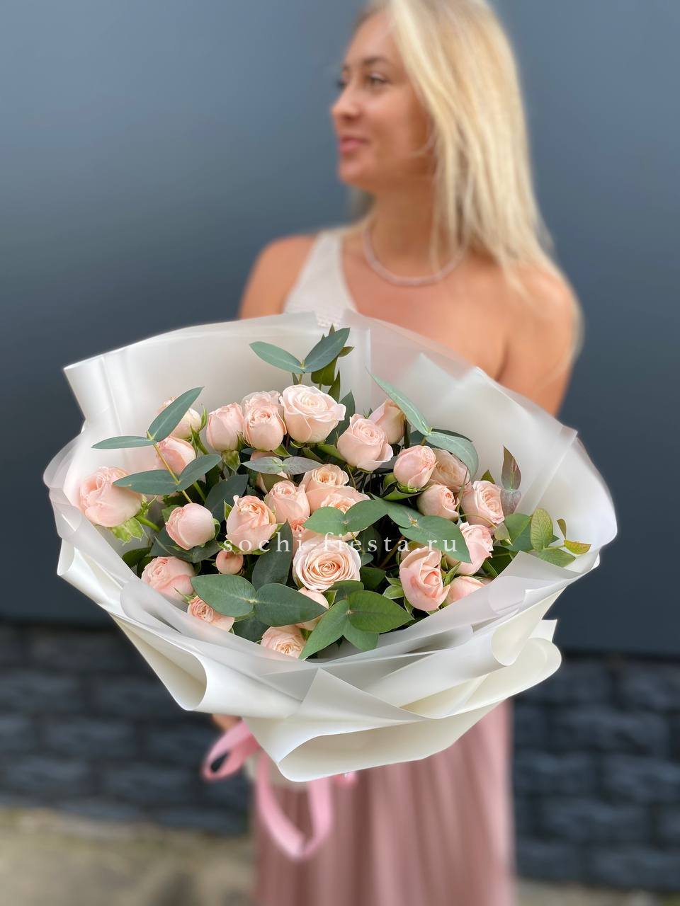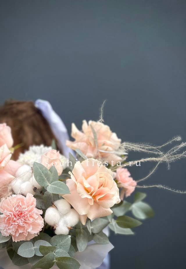 Этот букет — словно облако нежности и мечтательности. Бутончики кустовых роз, напоминающие тугие шарики, имеют светлый кремовый цвет с легким розовым оттенком. В сочетании с веточками свежего эвкалипта они создают атмосферу легкости и романтики. Это идеальный подарок для выражения самых светлых и теплых чувств, который растопит любое сердце.