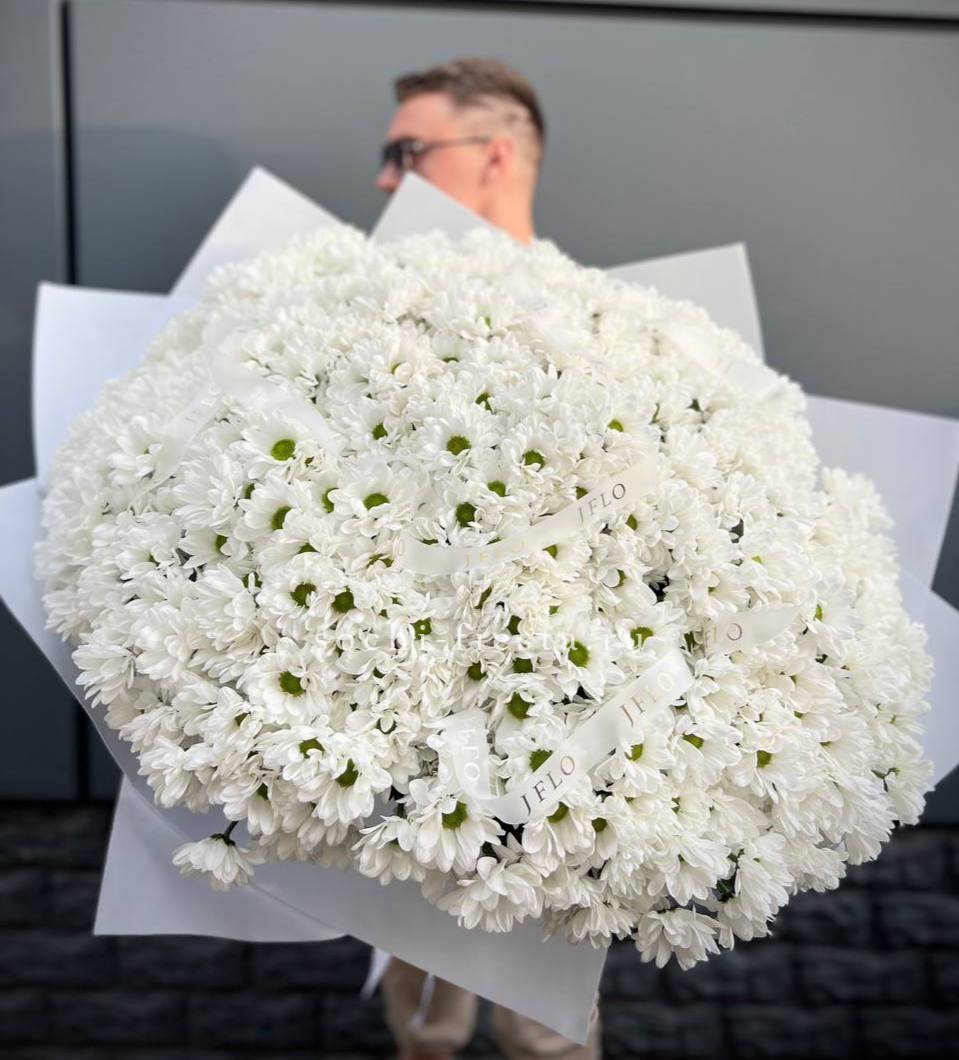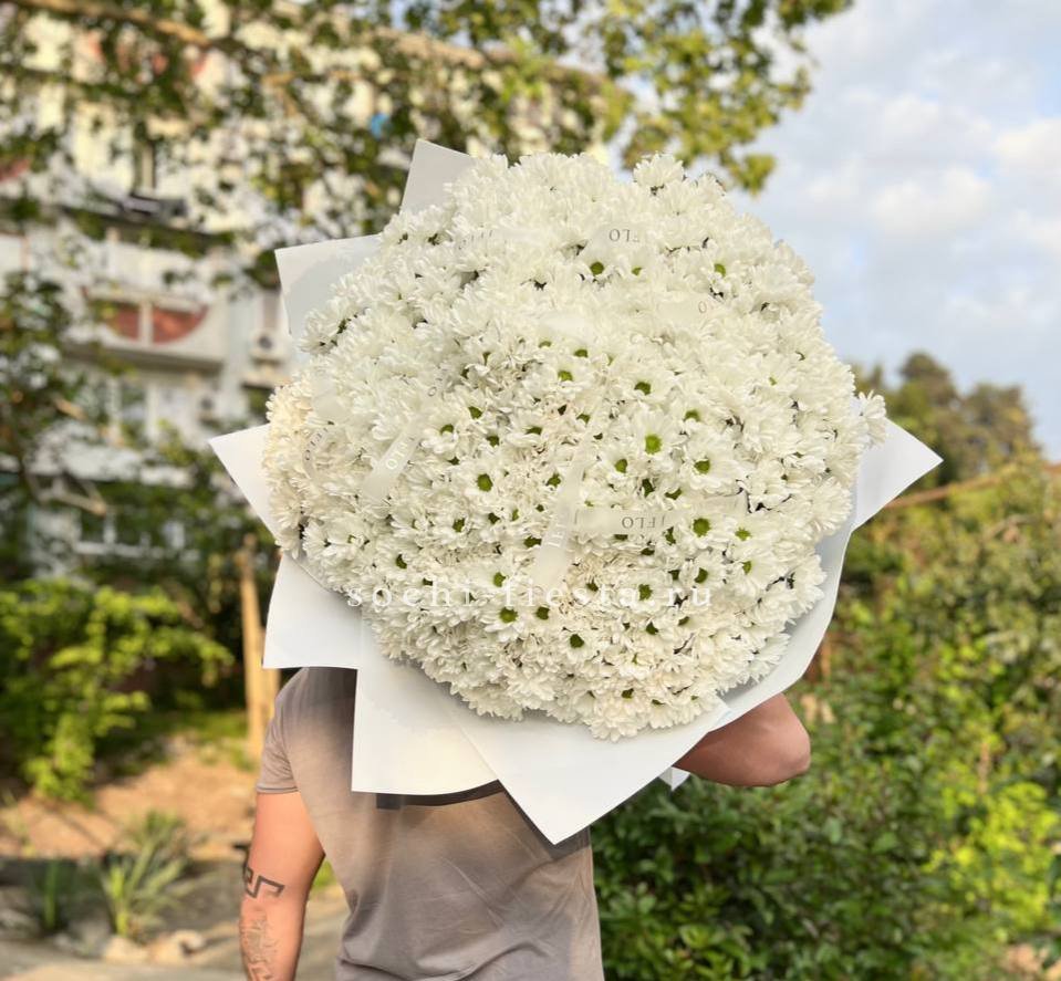 Белоснежные розы и герберы соседствуют с пушистыми шапками хризантем и воздушной статицей. Хлопок добавляет фактурный акцент, делая композицию объёмной и запоминающейся.