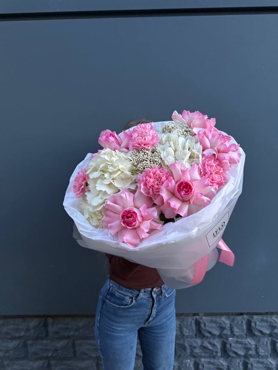 Розовые розы раскрываются среди воздушных соцветий гортензии и мелких бутонов диантуса. Озотамнус добавляет композиции лёгкость и объём. Букет собран плотно и держит форму без лишних деталей.