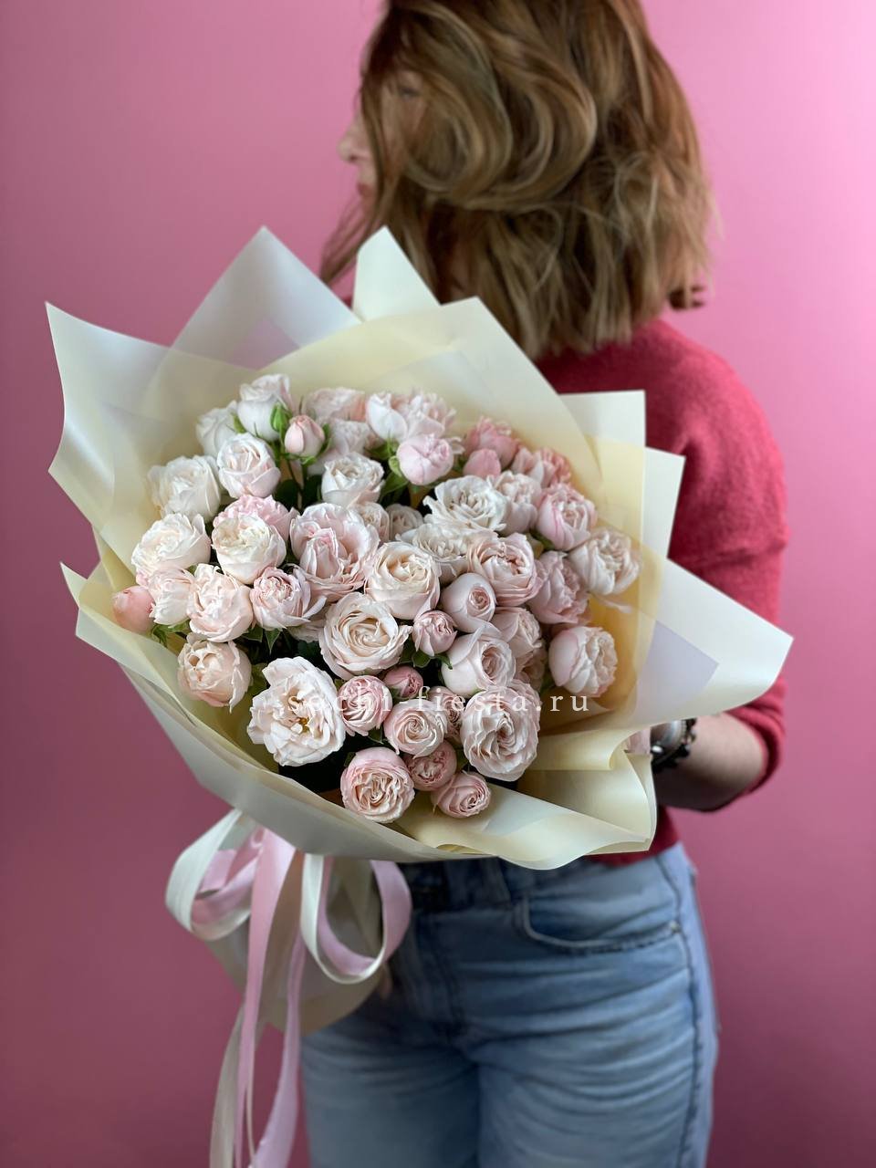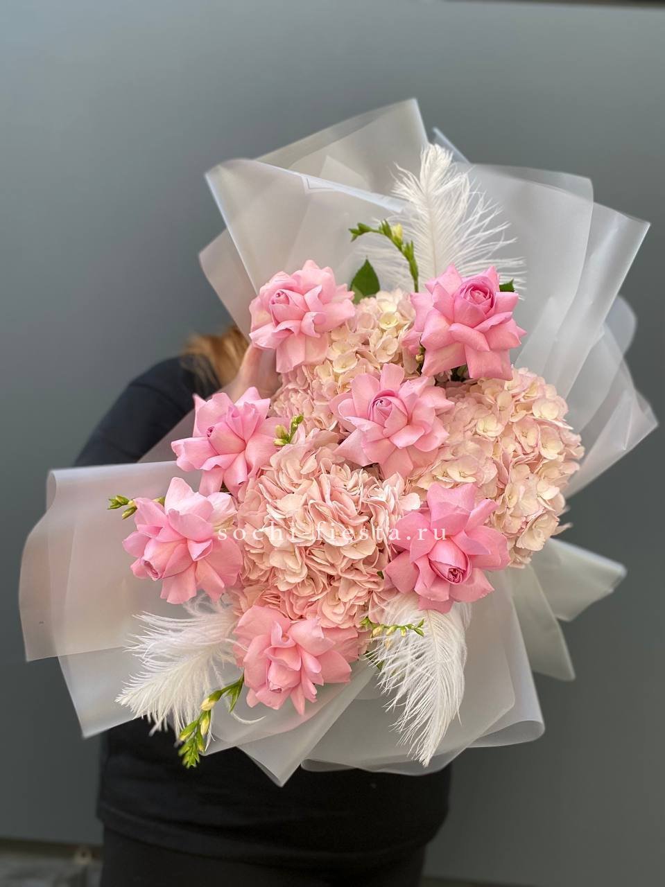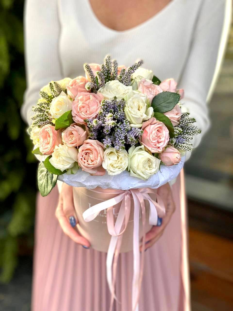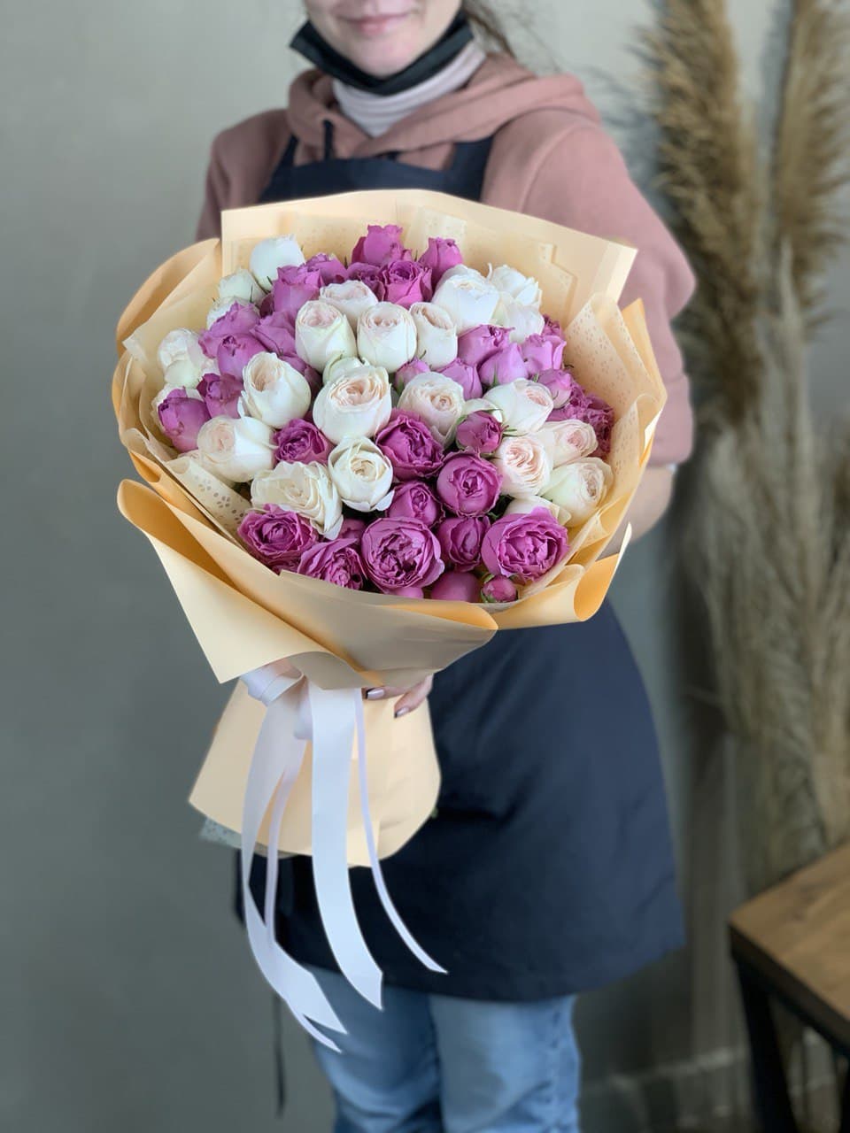 Пионовидные розы раскрываются густыми лепестками, хамелациум добавляет воздушности. Композиция держит форму и долго сохраняет свежесть.