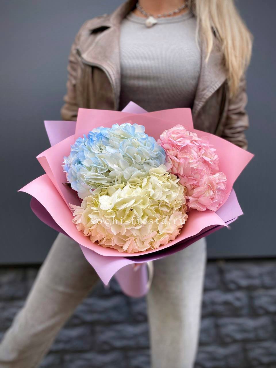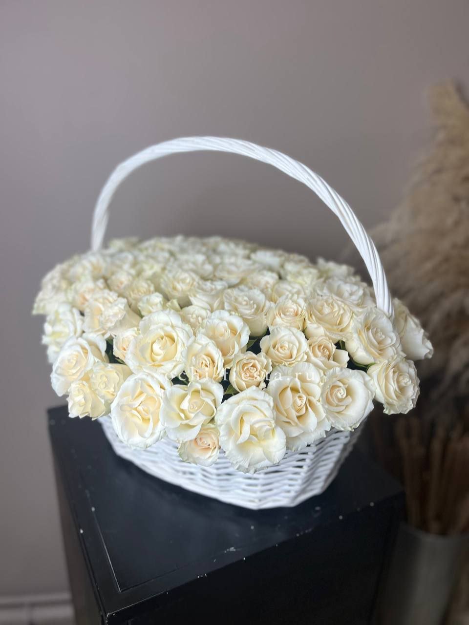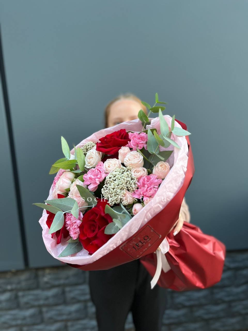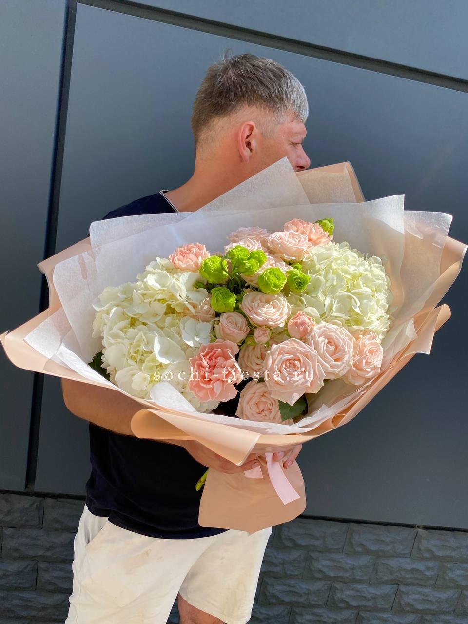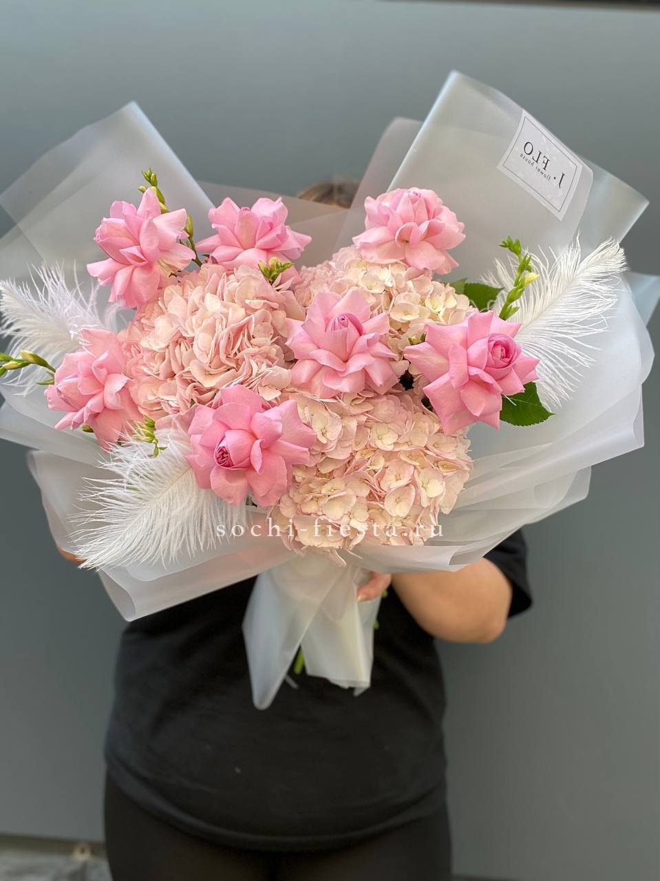Пионовидные розы раскрываются густыми лепестками, хамелациум добавляет воздушности. Композиция держит форму и долго сохраняет свежесть.