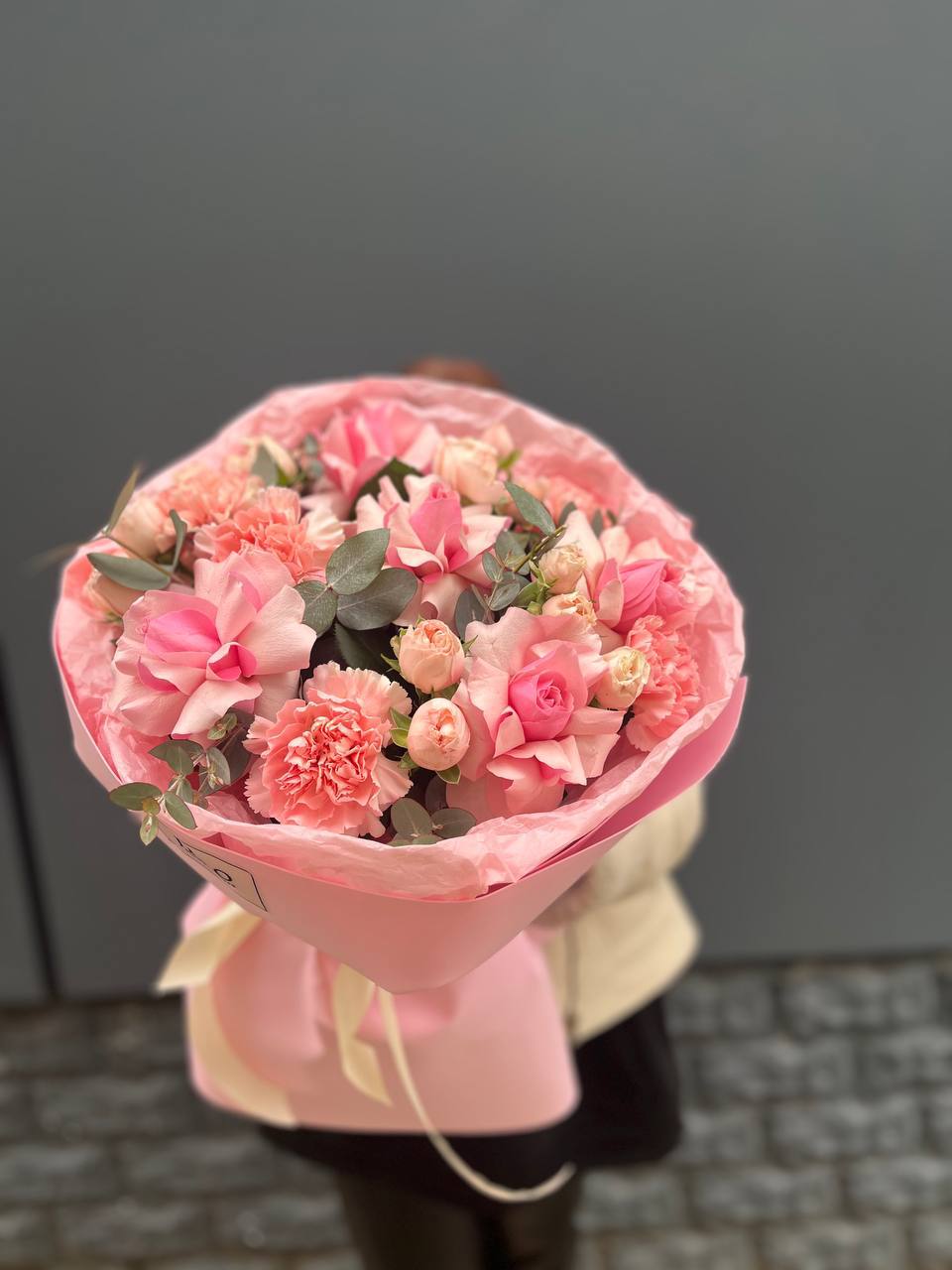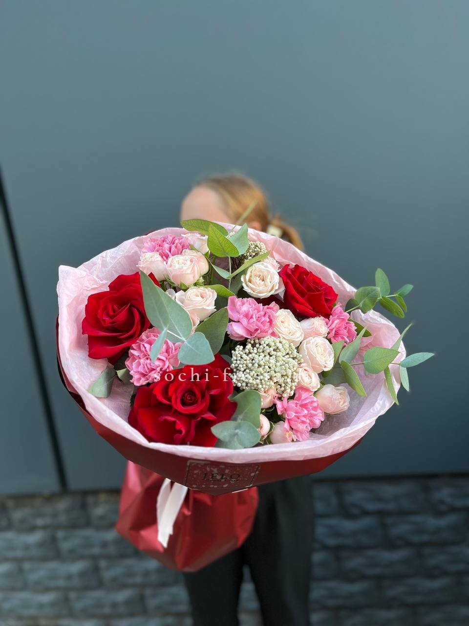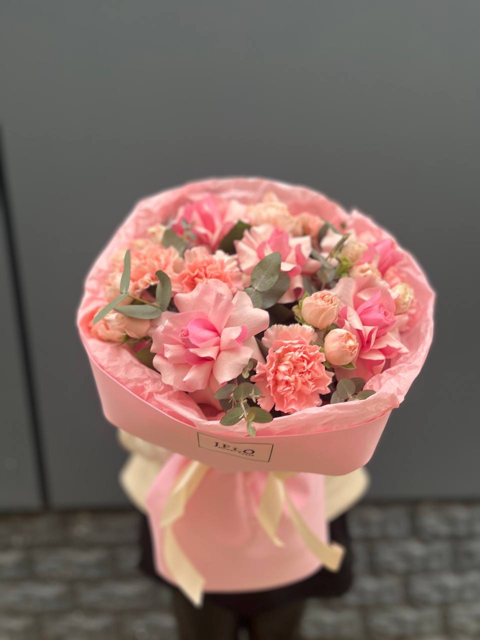 пионовидная роза, хамелациум (замена в несезон), эвкалипт, авторское оформление.