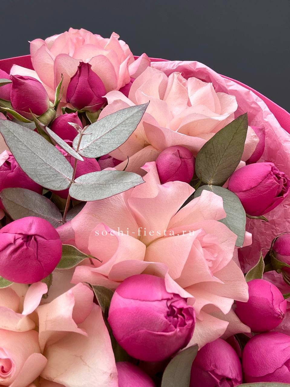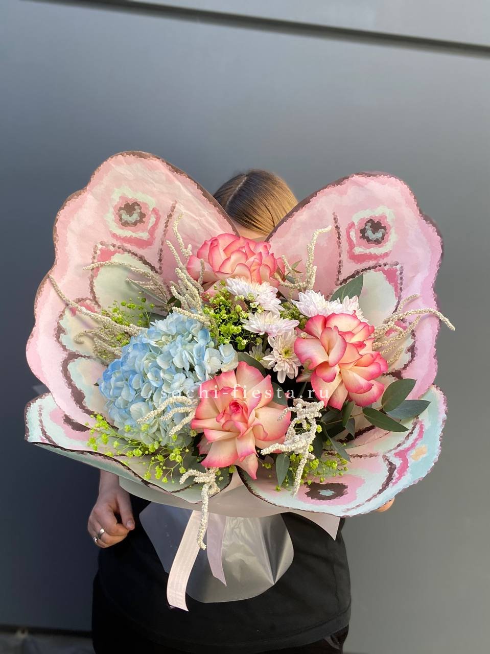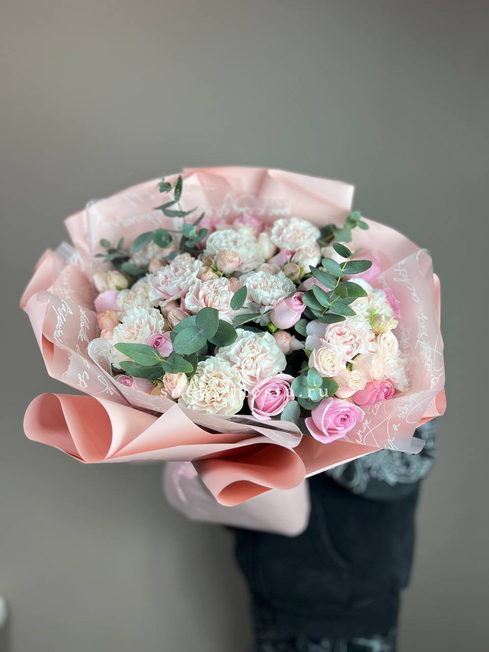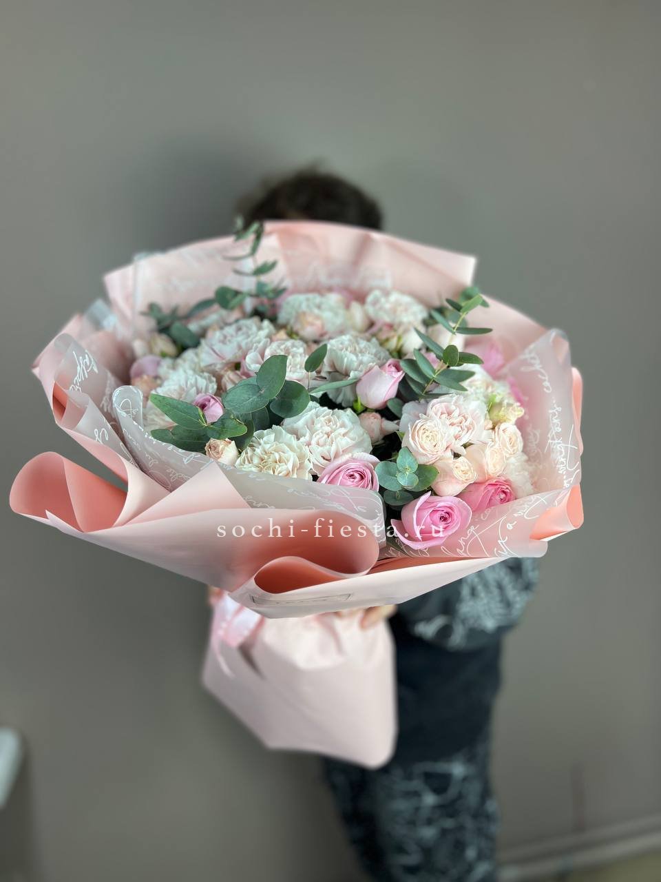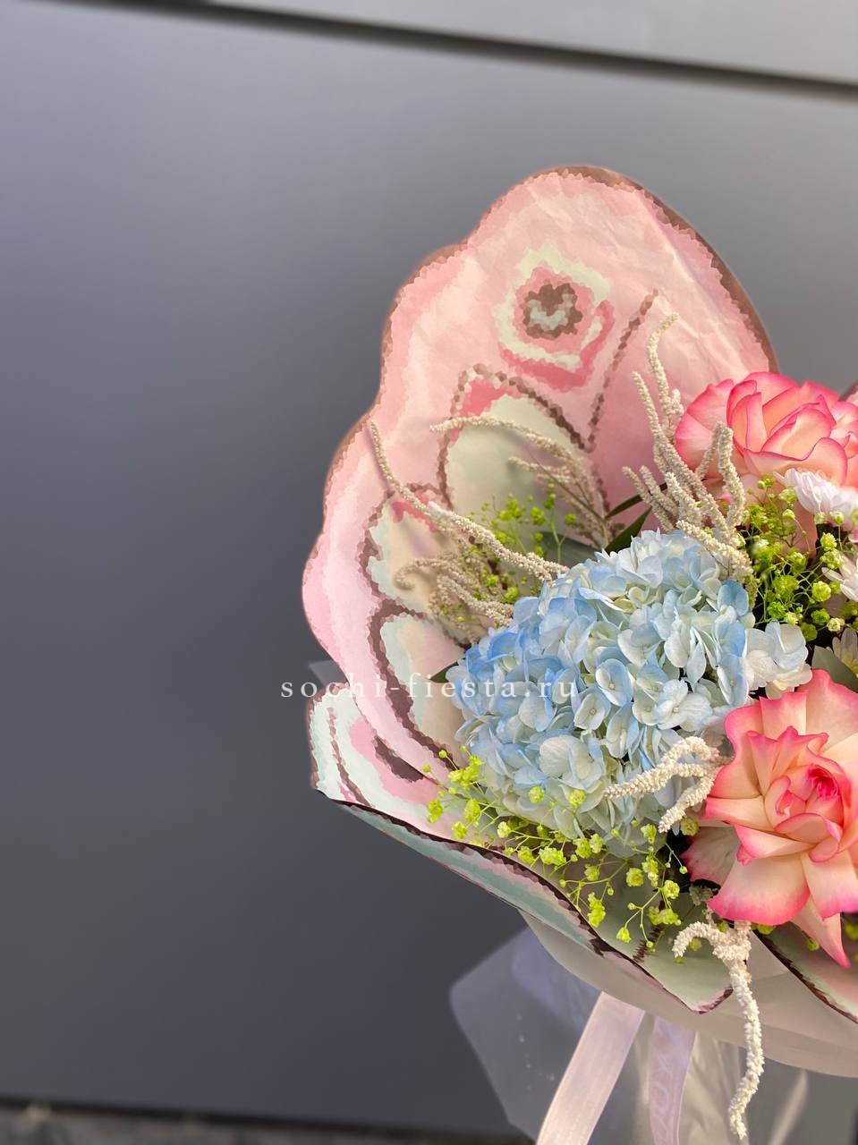 гортензия, роза, эустома, бомбастик,  эвкалипт, лента, дизайнерская пленка.