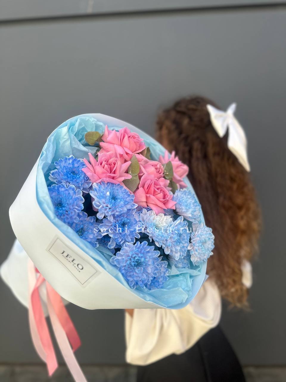 французские розы, маттиола, гортензии, эвкалипт, стифа, упаковка, лента.