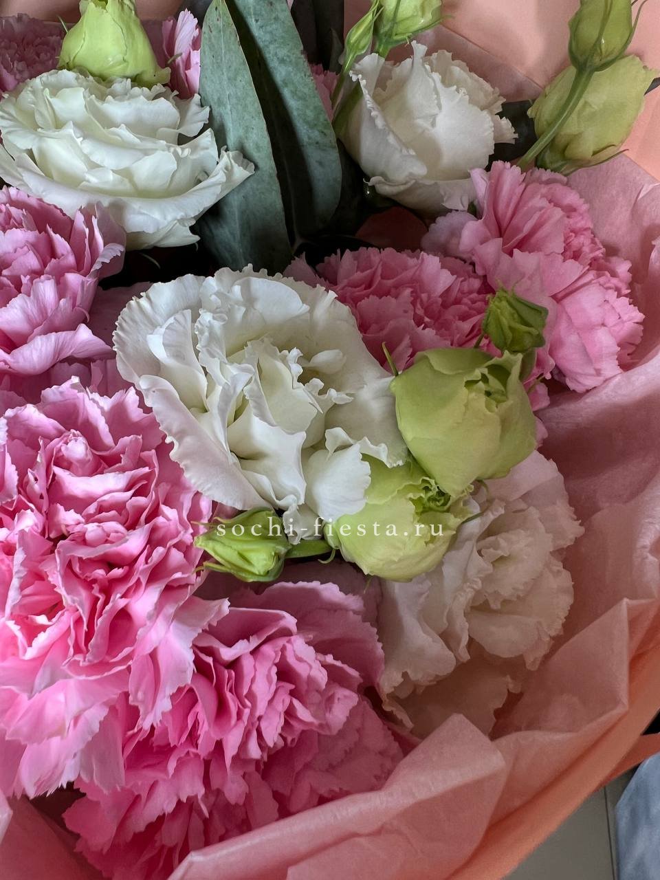 Воздушные соцветия эустомы переплетаются с яркими головками диантусов, создавая живую графику в обёртке. Каждый бутон раскрывается по-своему, добавляя композиции объём и движение. Букет для тех, кто ценит свежесть без лишних деталей.