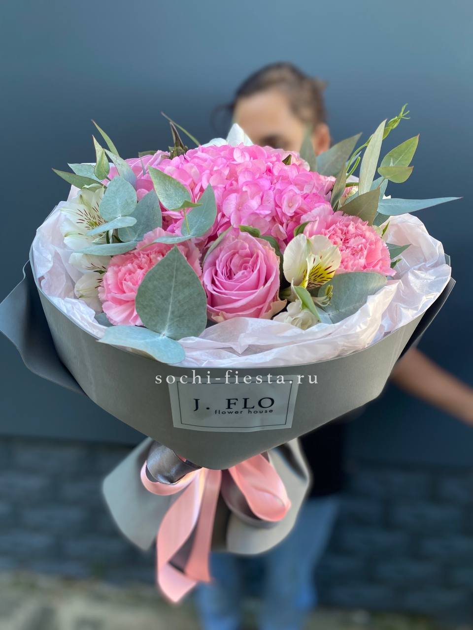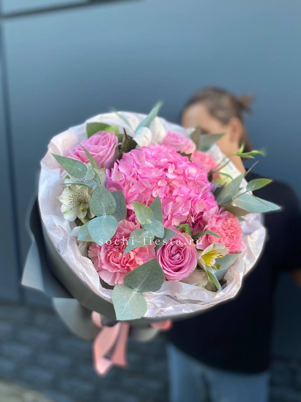 гортензия, бомбастик, диантусы, эвкалипт, антиринум, хризантема, пленка.