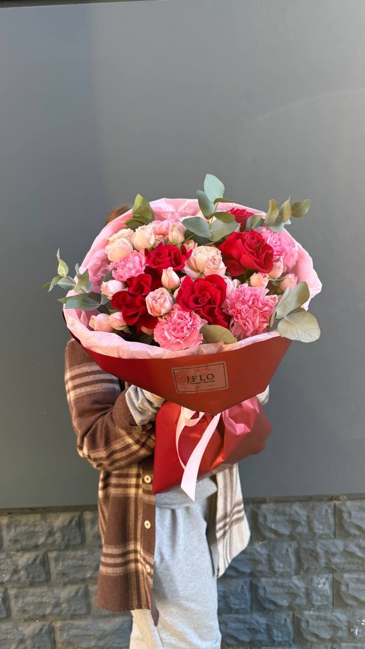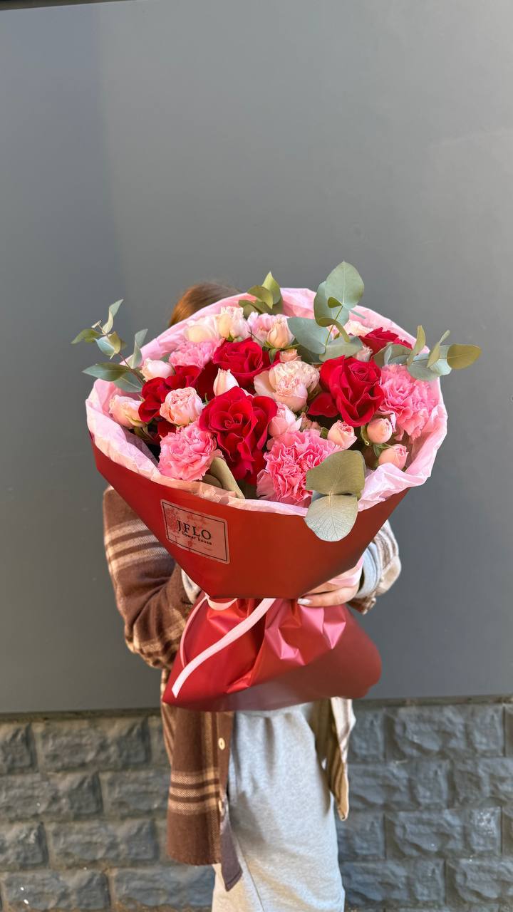 Розовые розы и диантусы окружены пышными соцветиями маттиолы и бомбастика. Композиция собрана плотно, каждый цветок поддерживает соседний, создавая объемную округлую форму. Букет держит силуэт и выглядит цельно с любого ракурса.