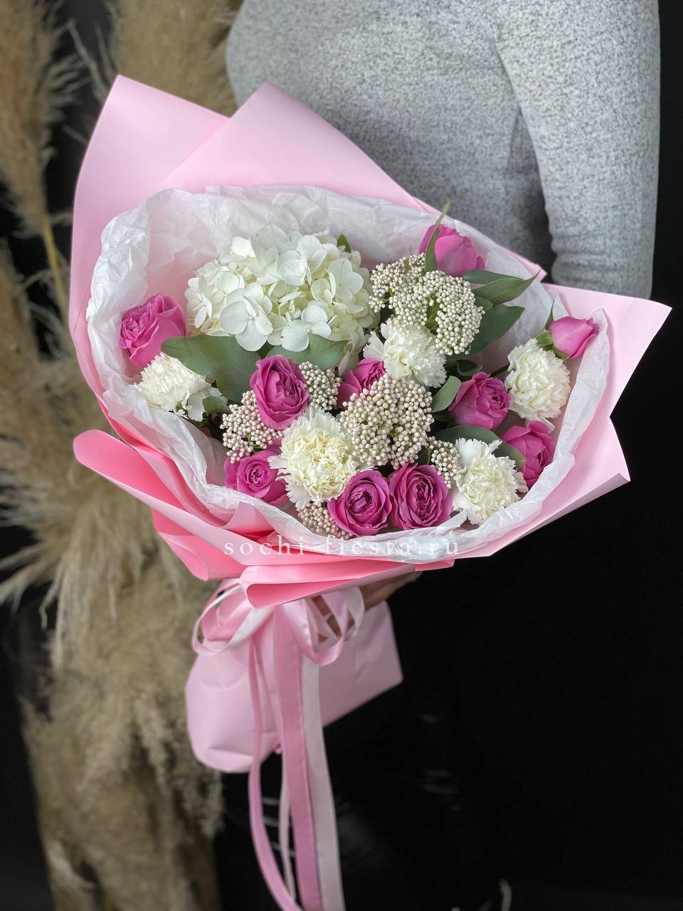 гортензия, герберы, розы, диантусы, хлопок,  авторское оформление.