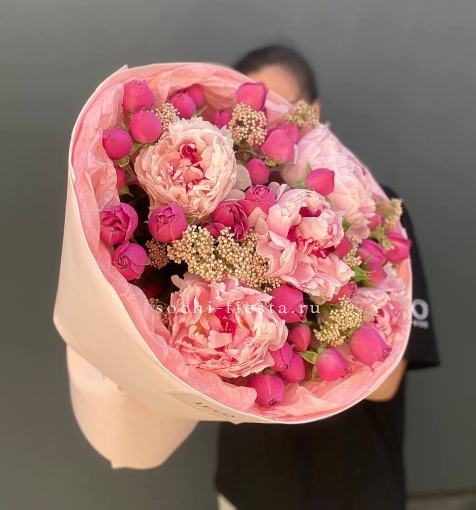 Пионы раскрыты полностью, их лепестки создают объёмную текстуру. Кустовые розы добавляют плотности, а озатамус заполняет промежутки мелкими соцветиями. Композиция выглядит пышно и живо.