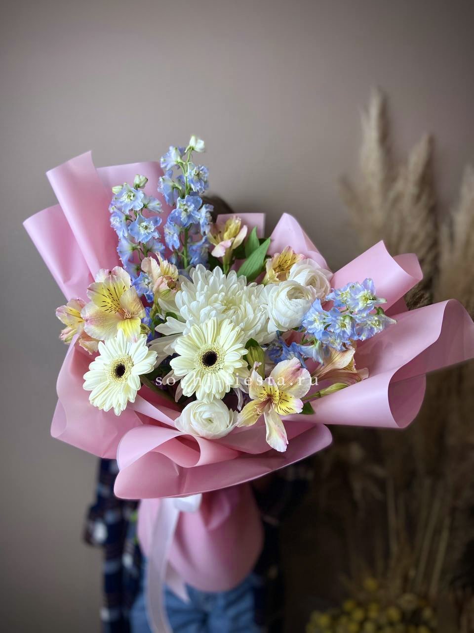 Яркий весенний микс из ранункулюсов, гербер и дельфиниума напоминает о первых солнечных днях. Насыщенные оттенки и разная высота стеблей добавляют букету живую динамику.