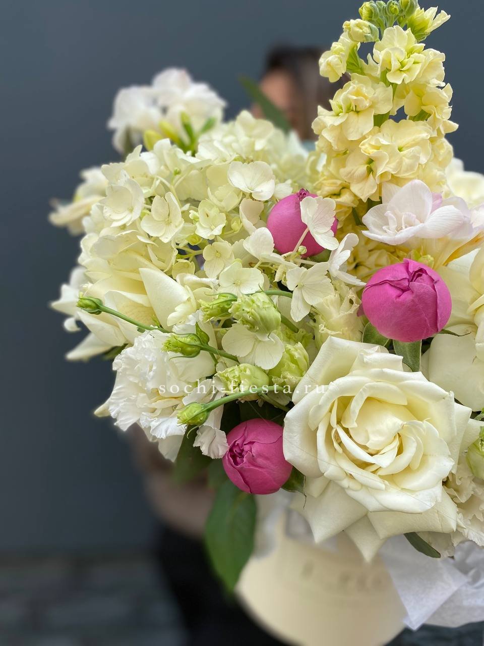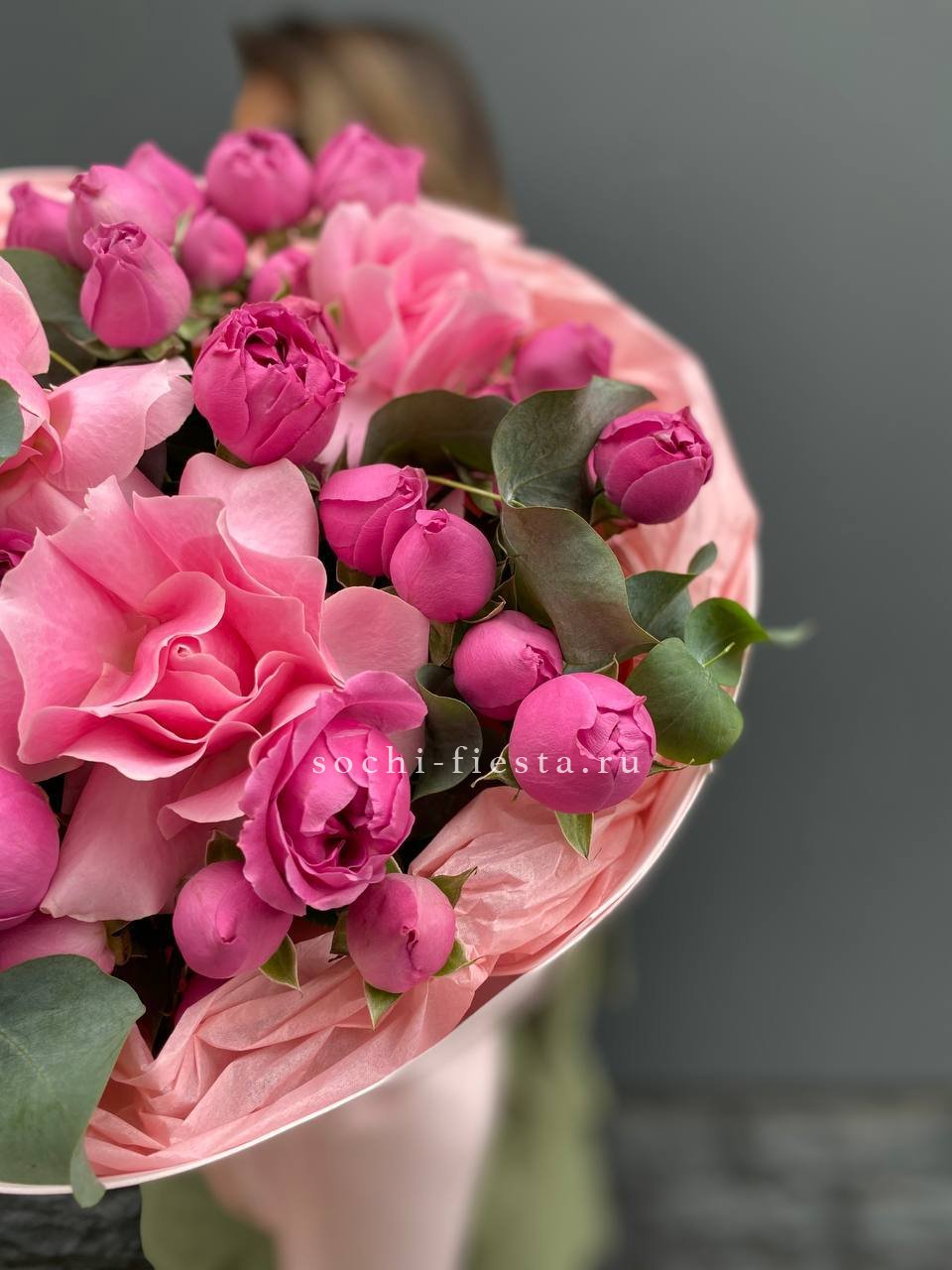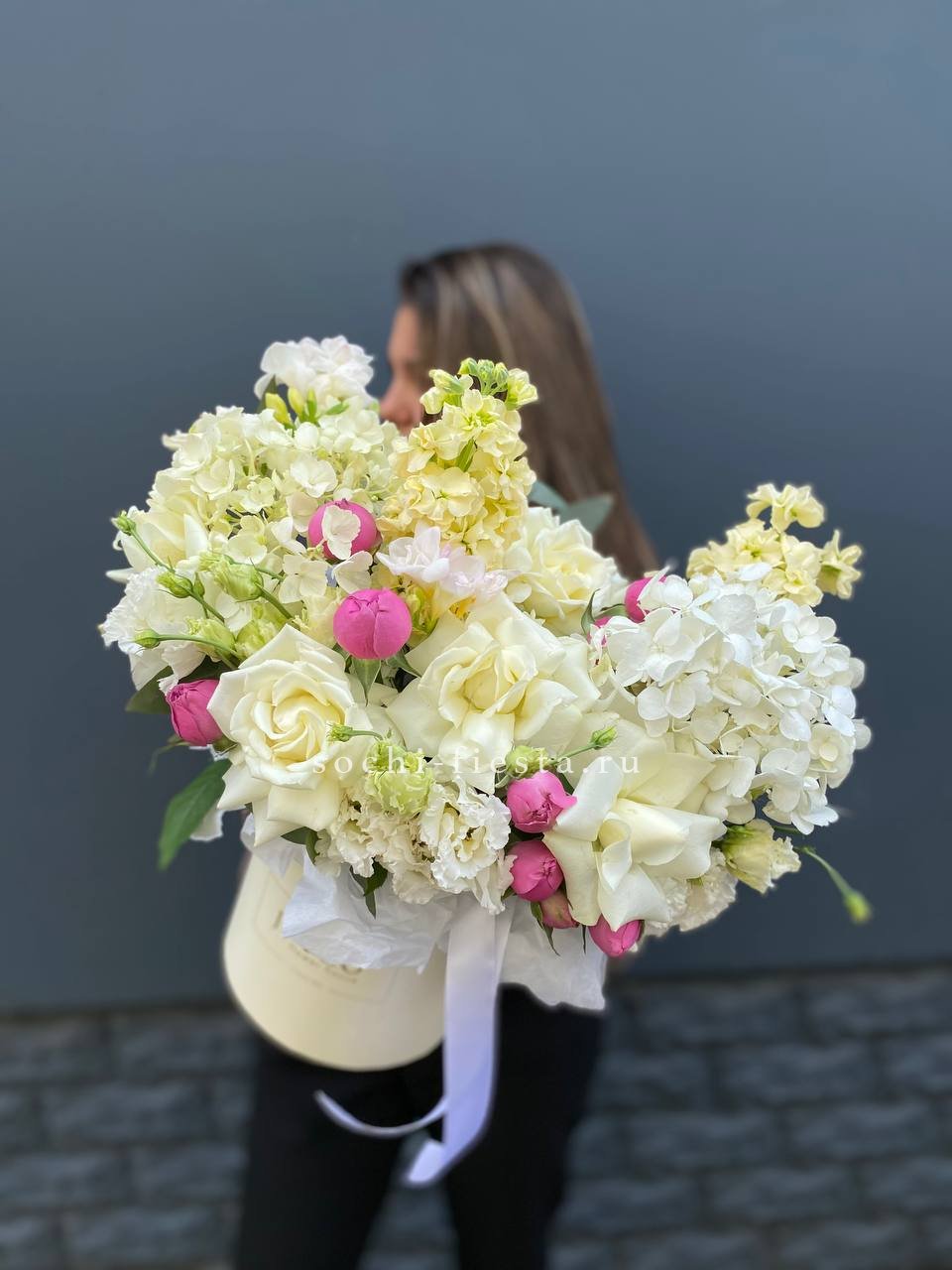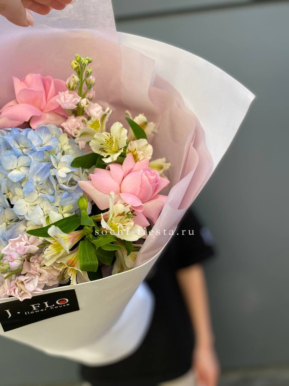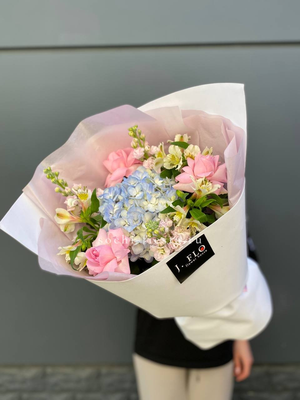 гортензия, диантус, кустовая пионовидная роза, эустома, вспомогательные цветы, эвкалипт, лента, дизайнерская упаковка.