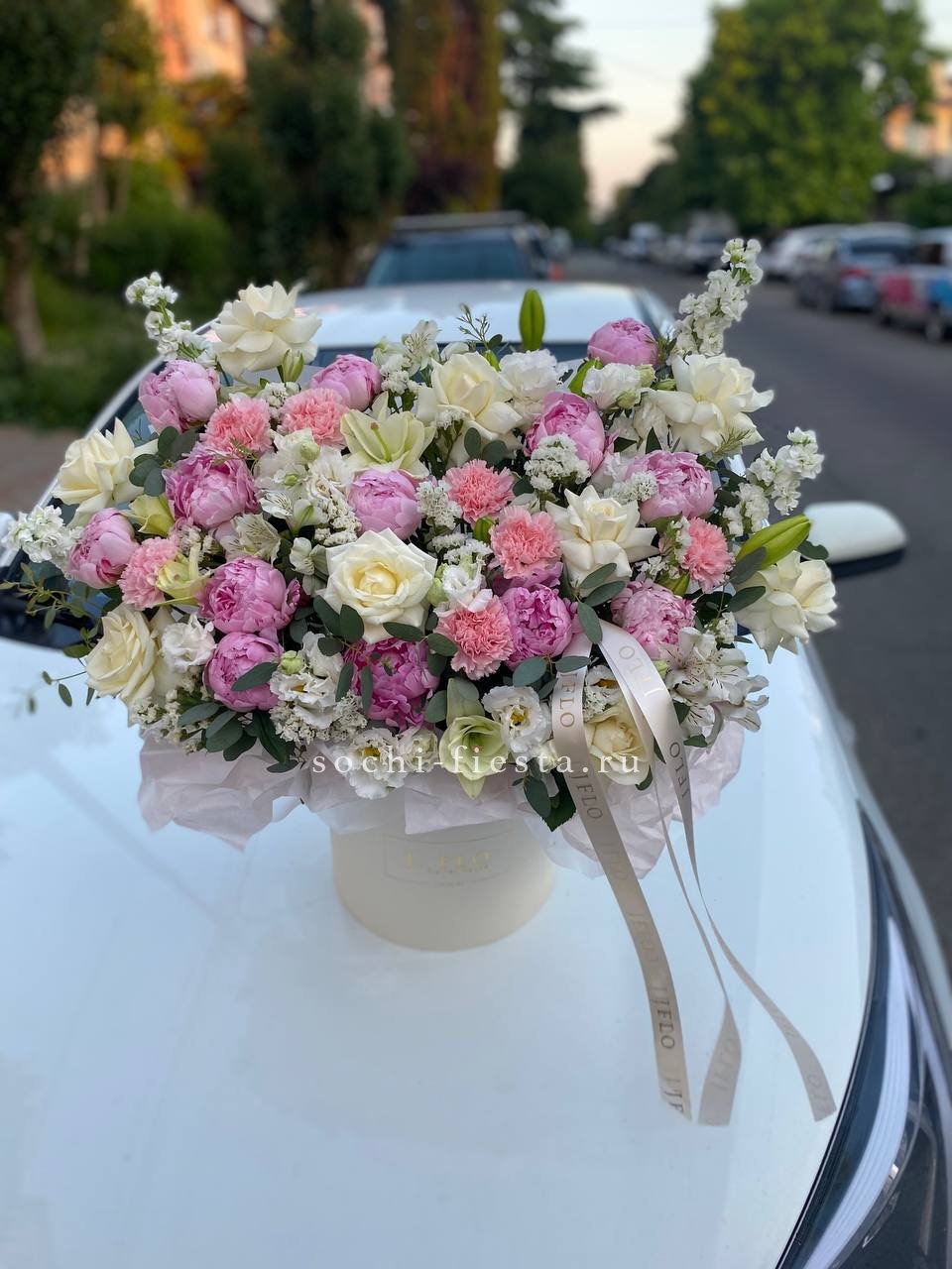 пионы, лилии, белые розы, эустомы, диантусы, маттиолы, статица, альстромерия, эвкалипт, цилиндр - D25, лента, упаковка. Состав может меняться в зависимости от сезона.