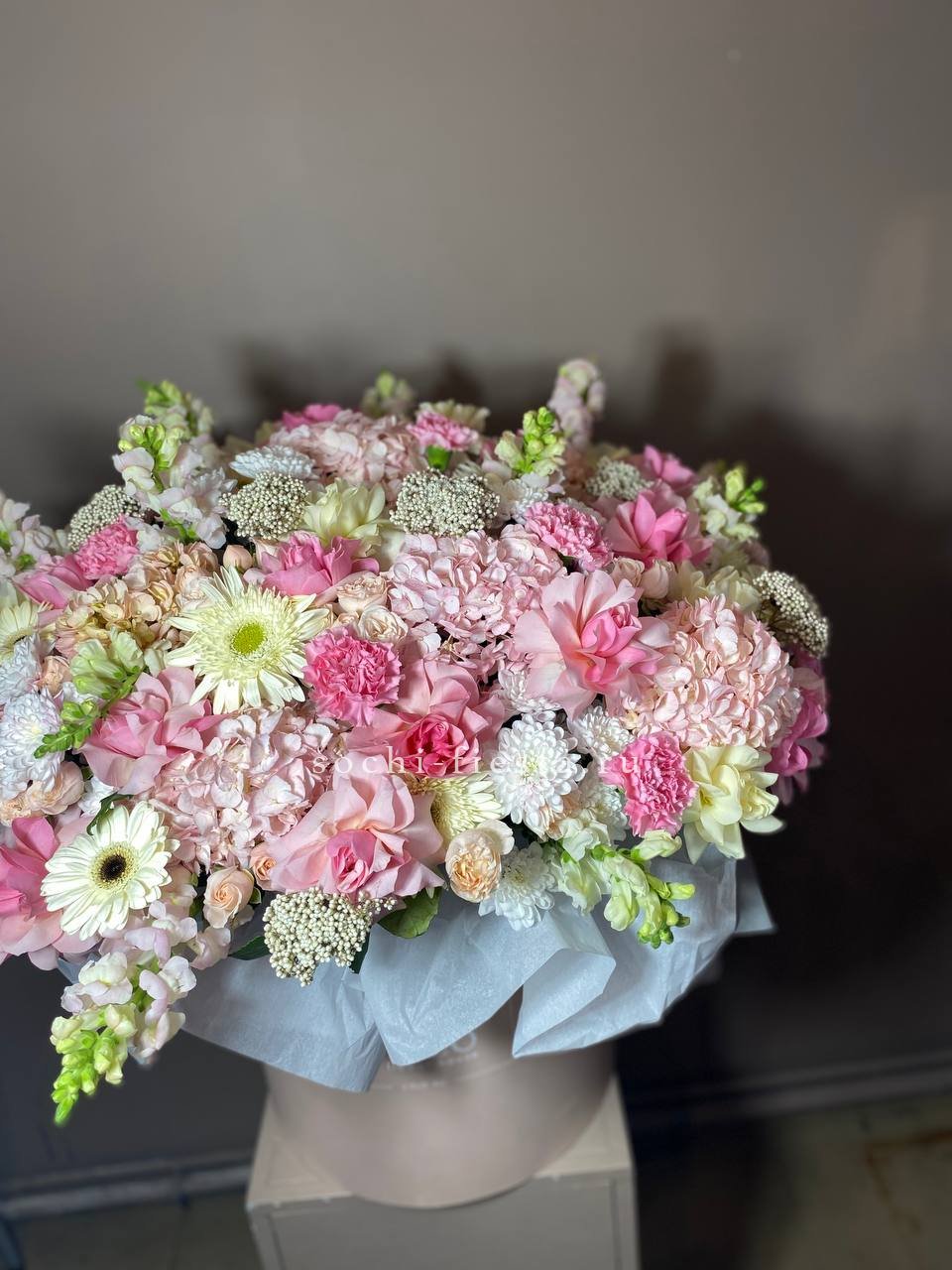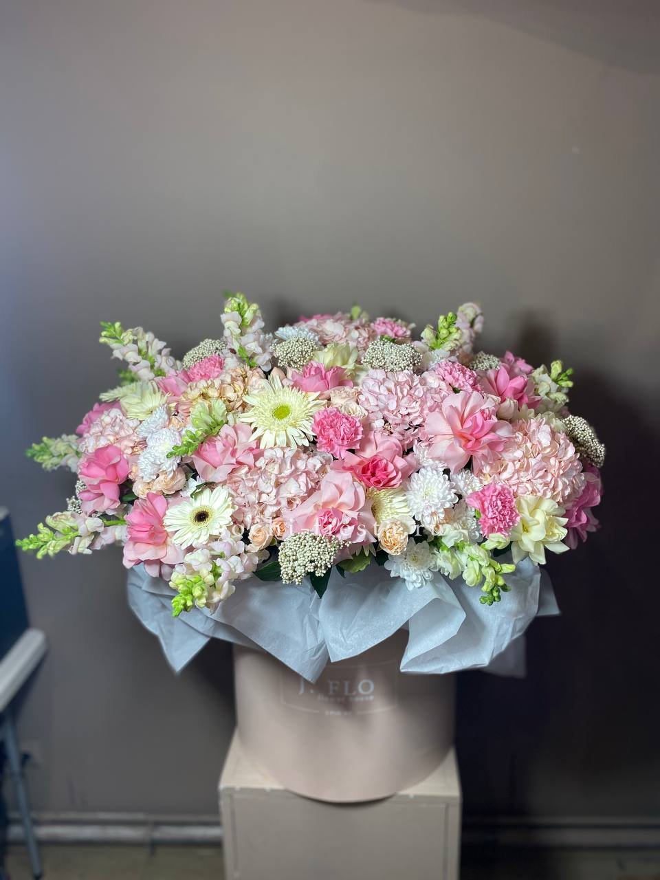 Микс из пионов, лилий и эустом в объёмном цилиндре создаёт впечатление пышного сада. Белые розы и маттиолы наполняют пространство светом, а статица добавляет графики.