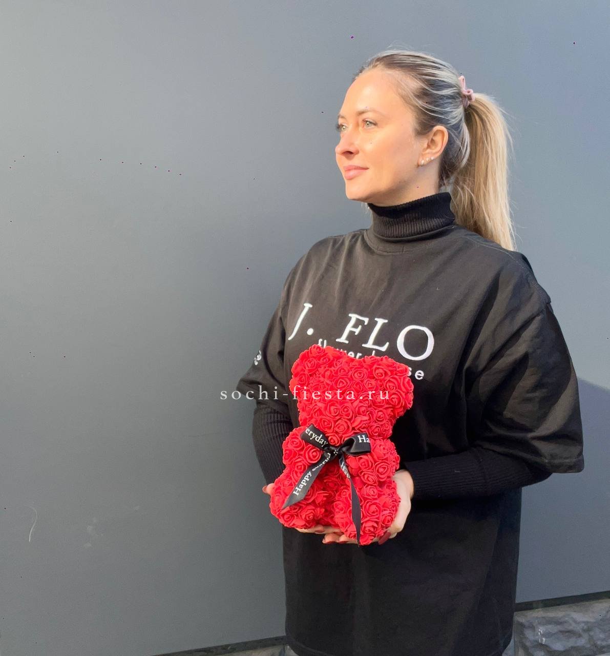 Фигурка медведя собрана из бутонов насыщенного алого оттенка. Каждый лепесток из фоамирана сохраняет форму и цвет без изменений. Компактная композиция для тех, кто ценит долговечность.