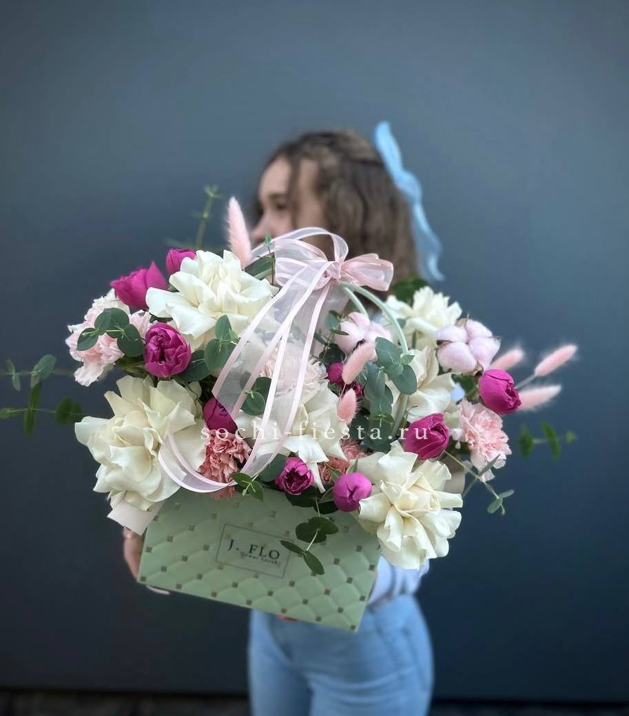 герберы, эустома, белая роза, эвкалипт, лента, сумка-кашпо.