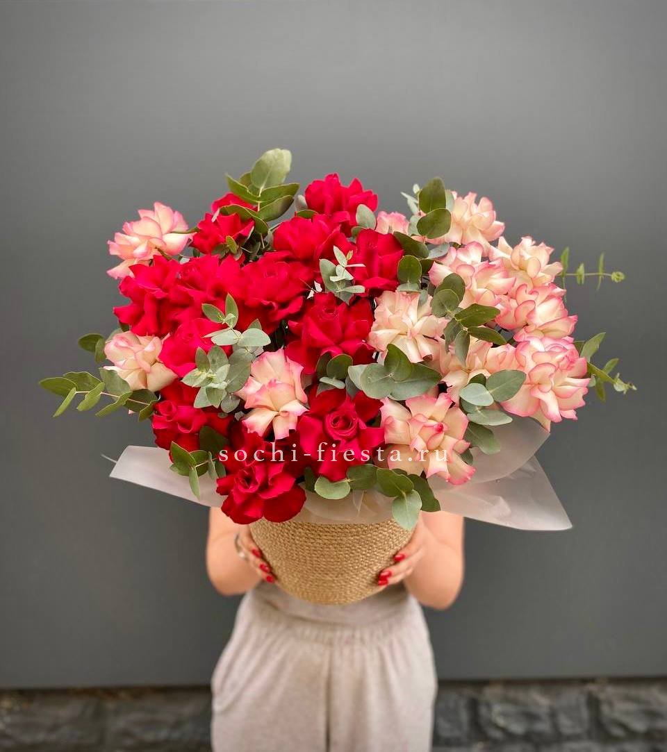 Яркие герберы задают ритм всей композиции, белая роза и эустома добавляют воздуха между соцветиями. Эвкалипт создает свежий фон для этого микса в удобной сумке-кашпо.