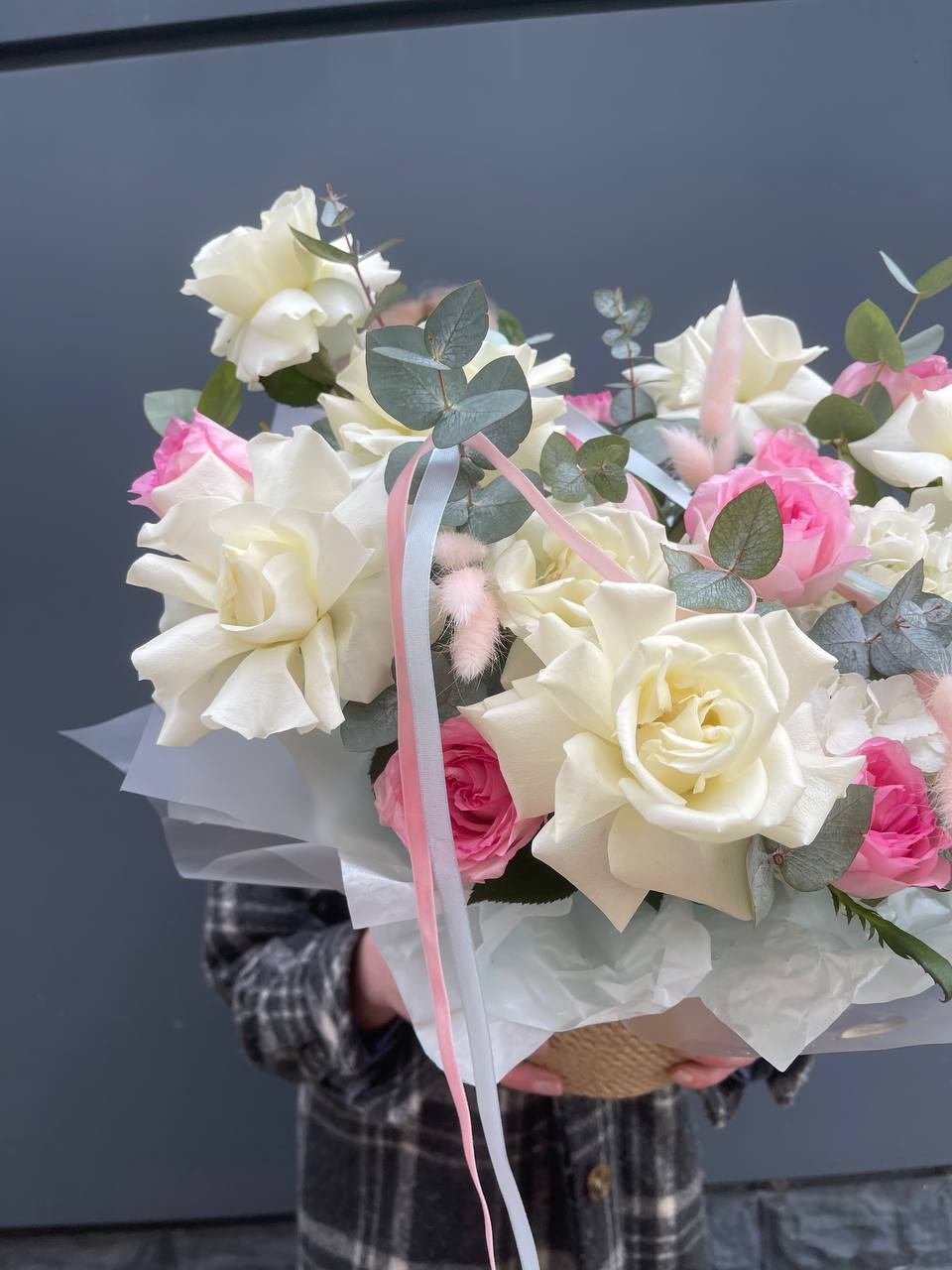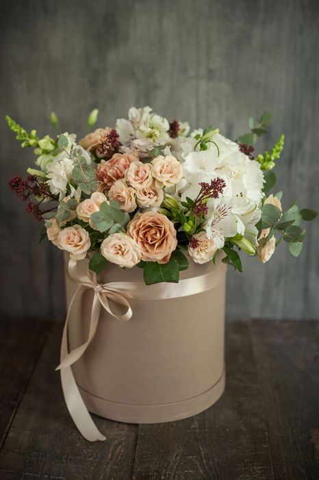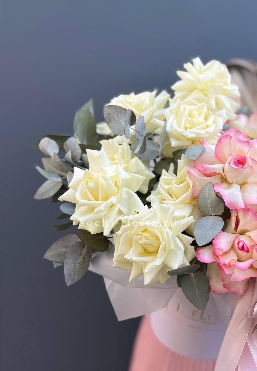 Вывернутые лепестки роз открывают внутреннюю текстуру бутонов и добавляют объема композиции. Гортензия и эустома заполняют пространство между крупными головками и создают многослойность.