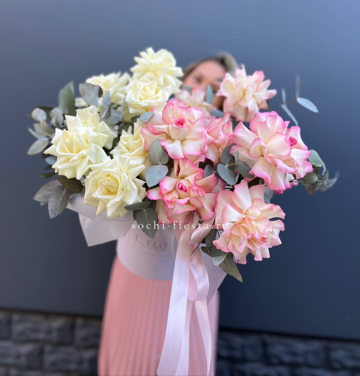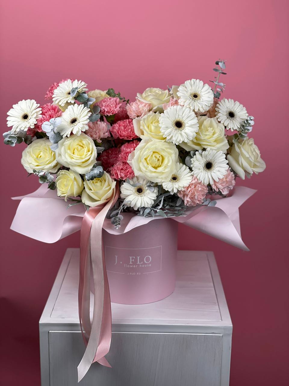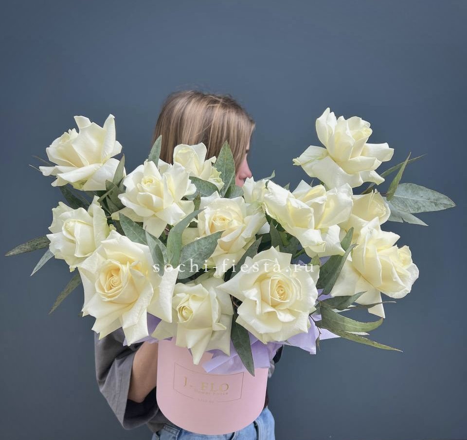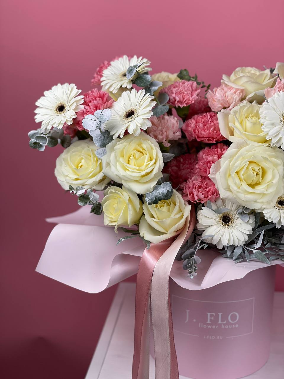 гортензия, вывернутые розы, диантус, кустовая роза, эустома, бокс D20, тишью.