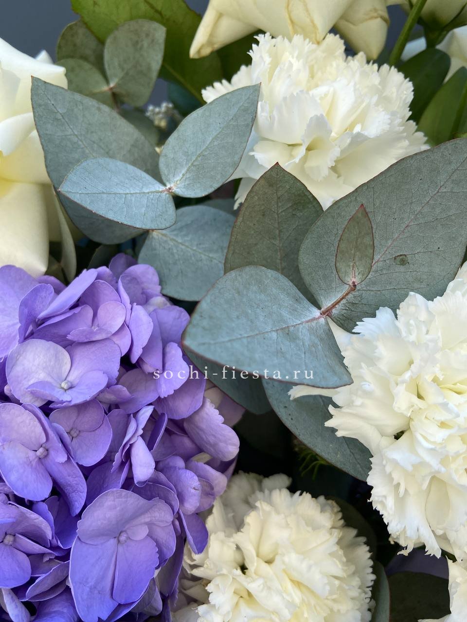 вывернутые белые розы, диантус, эустома, гортензия, цилиндр, эвкалипт, лента, упаковка.