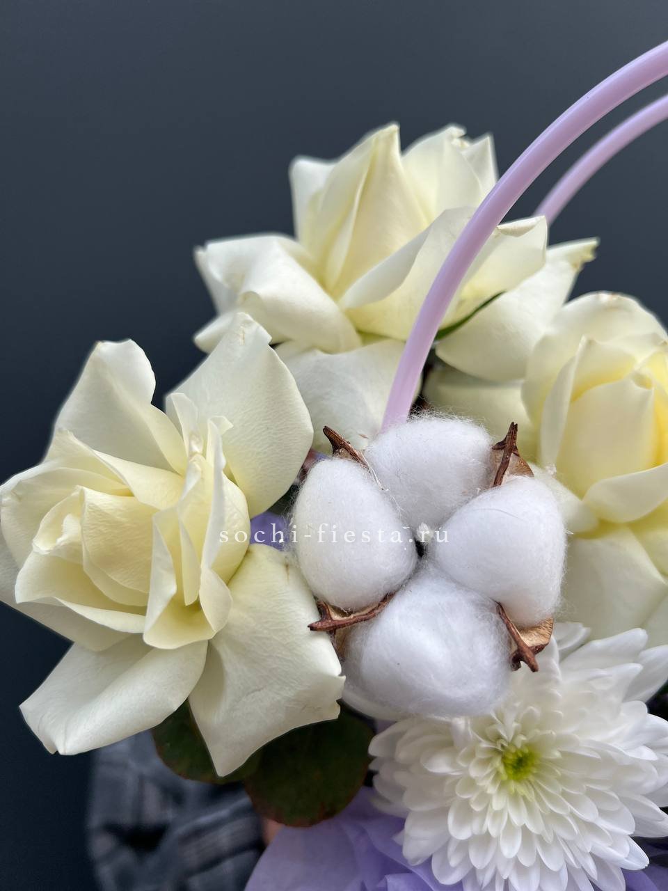 Белые розы и гортензия формируют объёмную основу, лилии вытягивают композицию вверх. Диантус и статица заполняют промежутки, создавая плотную текстуру в цилиндре.