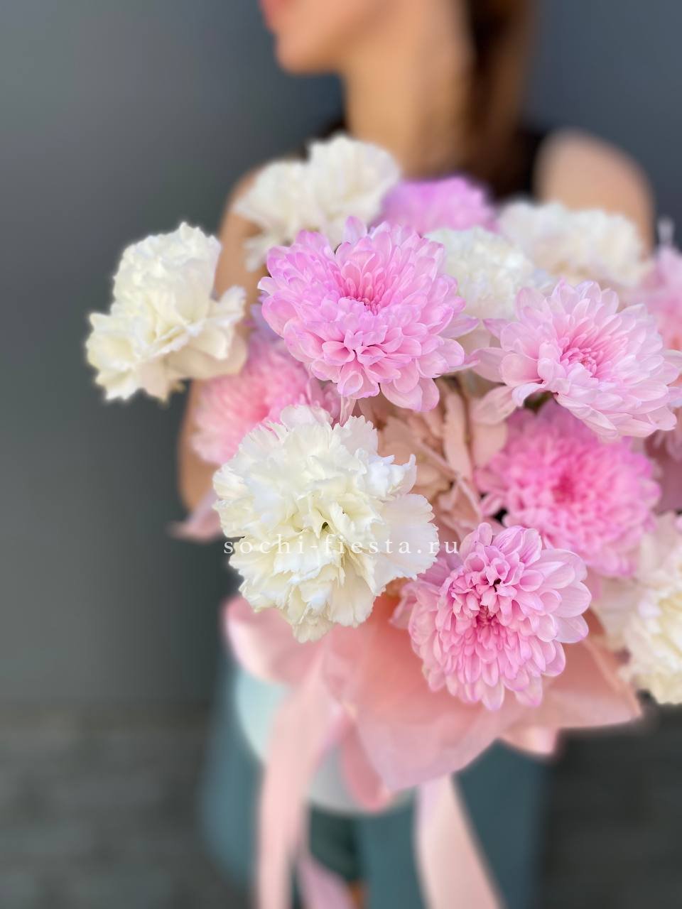 хризантемы, диантусы, пионы, цилиндр D13, эвкалипт, лента, тишью.