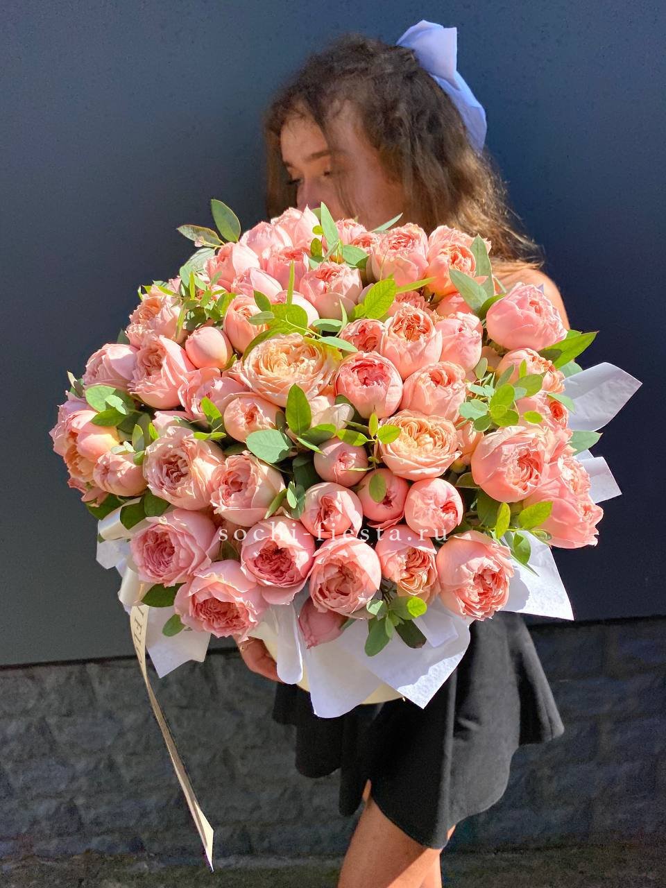 кустовые пионовидные розы сорта Джульетта, цилиндр D20, эвкалипт, лента, тишью.