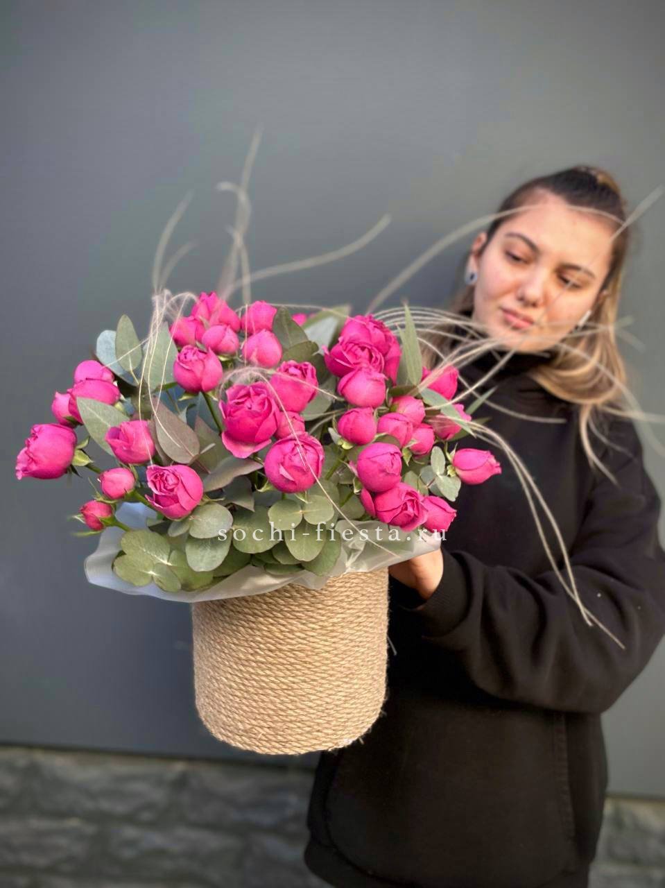 розы и гацинты в джутовом кашпо.