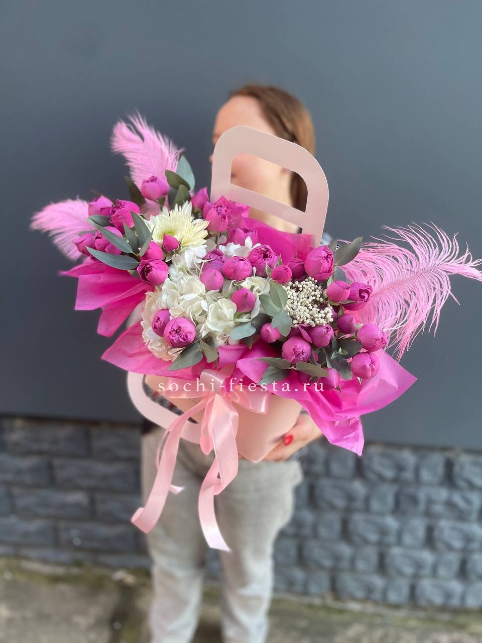 гортензия, розы, эустома, эвкалипт, диантус, лента, сумка.