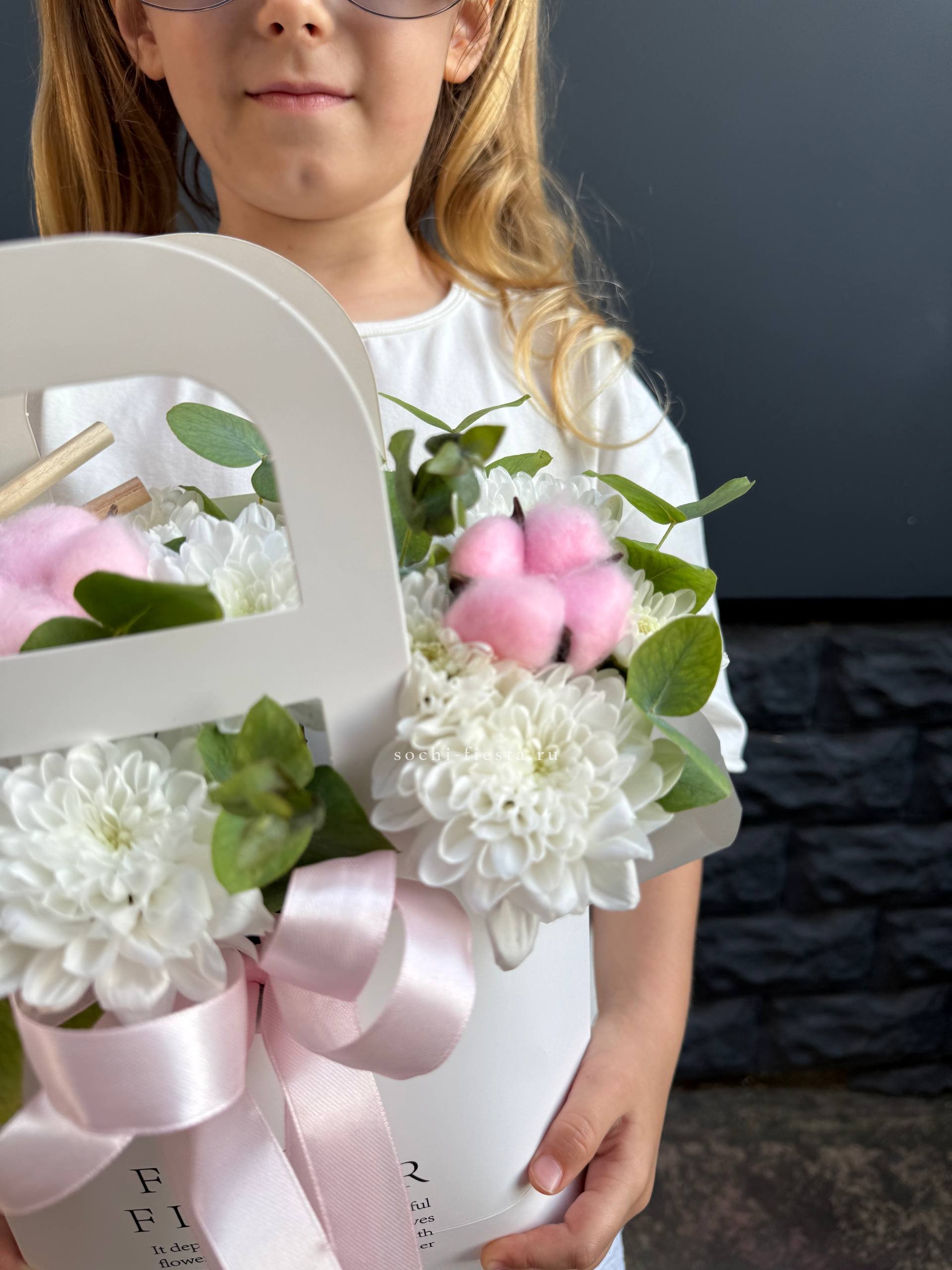 Хризантемы с пушистыми коробочками хлопка создают теплую домашнюю композицию в удобной сумочке. Цветы долго радуют взгляд и не требуют сложного ухода. Формат подходит для размещения в любом уголке дома.