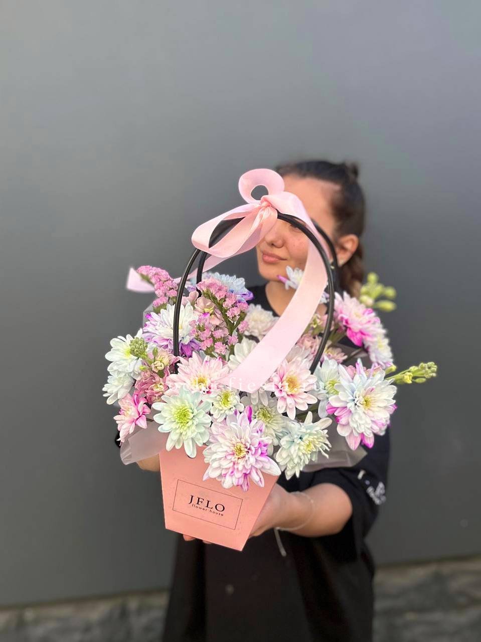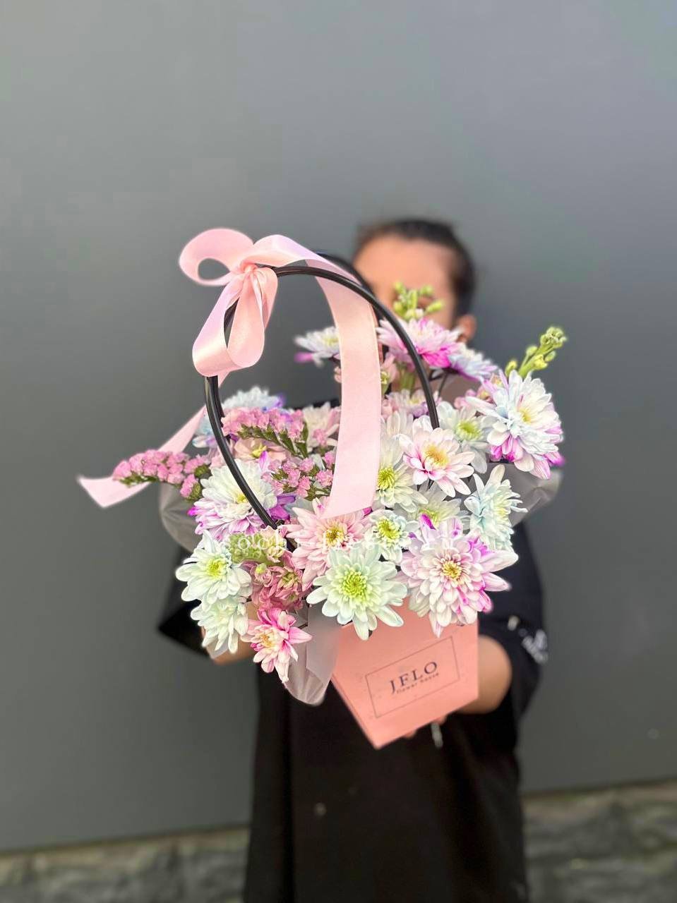Хризантемы и маттиола собраны в компактную форму с лиловыми переливами. Статица добавляет воздушности, а сумочка делает композицию мобильной и готовой к вручению. Цветы закреплены в оазисе для длительной свежести.