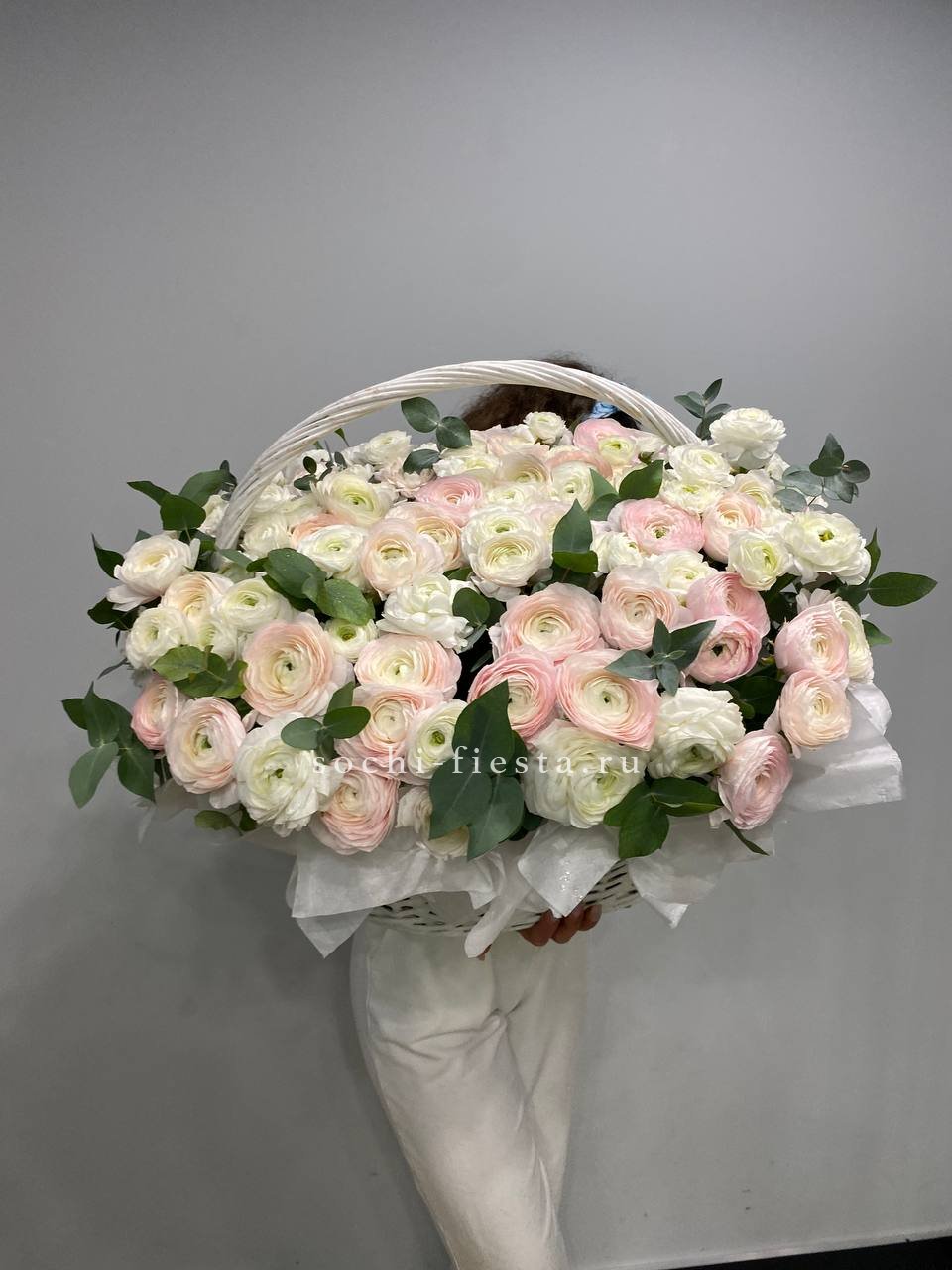 цветочная корзина с розами, мисти баблс, диантусами и гортензией.
