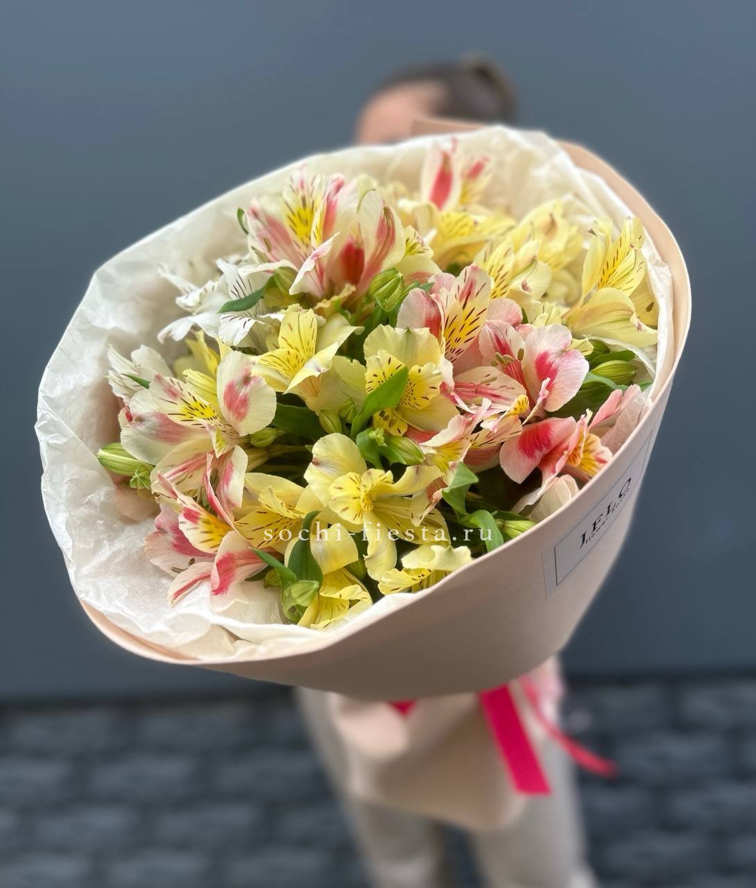 Девять альстромерий в воздушной упаковке пастельных оттенков выглядят мягко и свежо. Бутоны разной степени раскрытия добавляют букету глубины и лёгкой игривости.