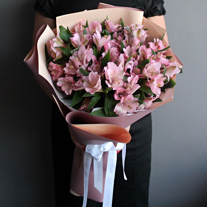альстромерия - 15 шт., лента, белая дизайнерская бумага.
