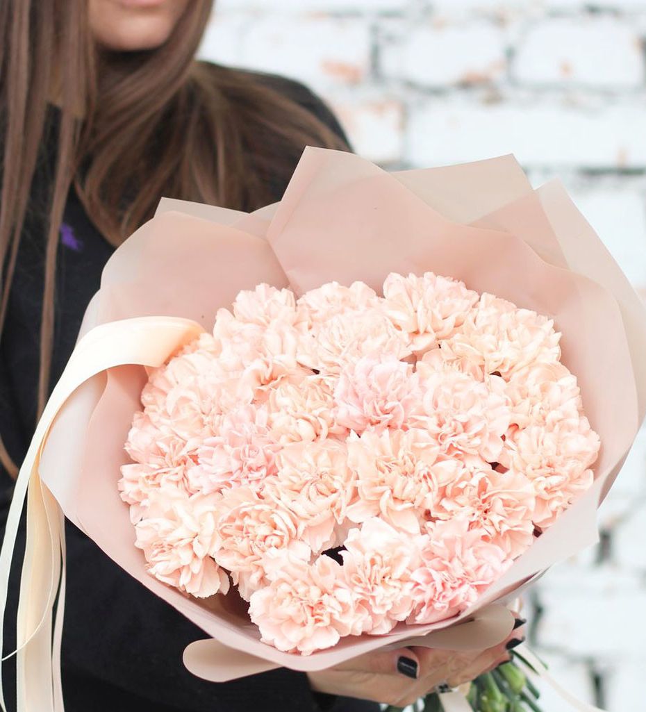 Диантусы с их густыми бутонами и резной формой лепестков выглядят графично и современно. Белый цвет усиливает архитектурность линий и создаёт чёткий визуальный ритм.