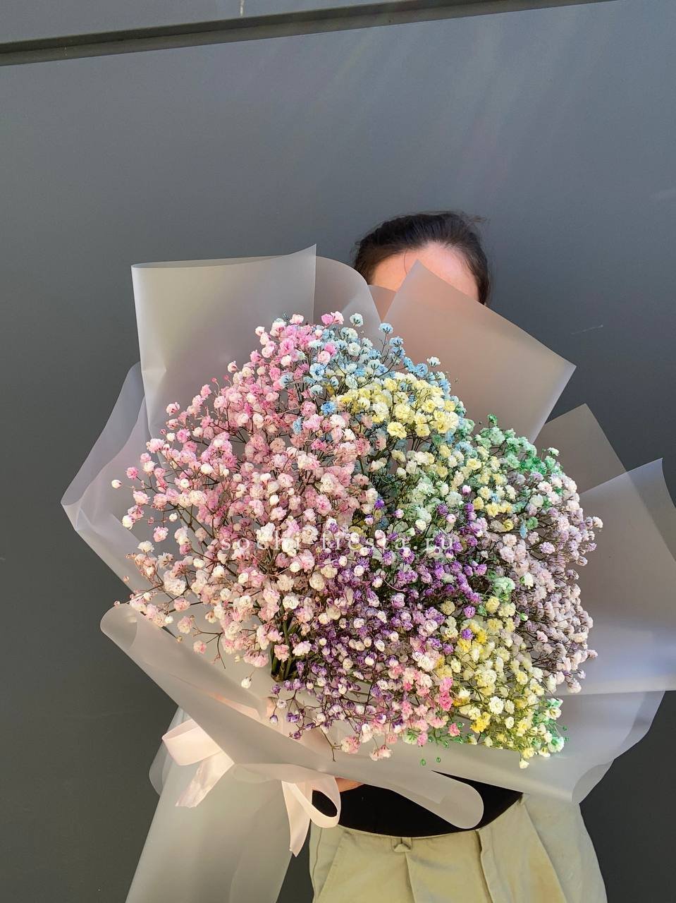 7 радужных голландских гипсофил, лента, комбинированная упаковка.