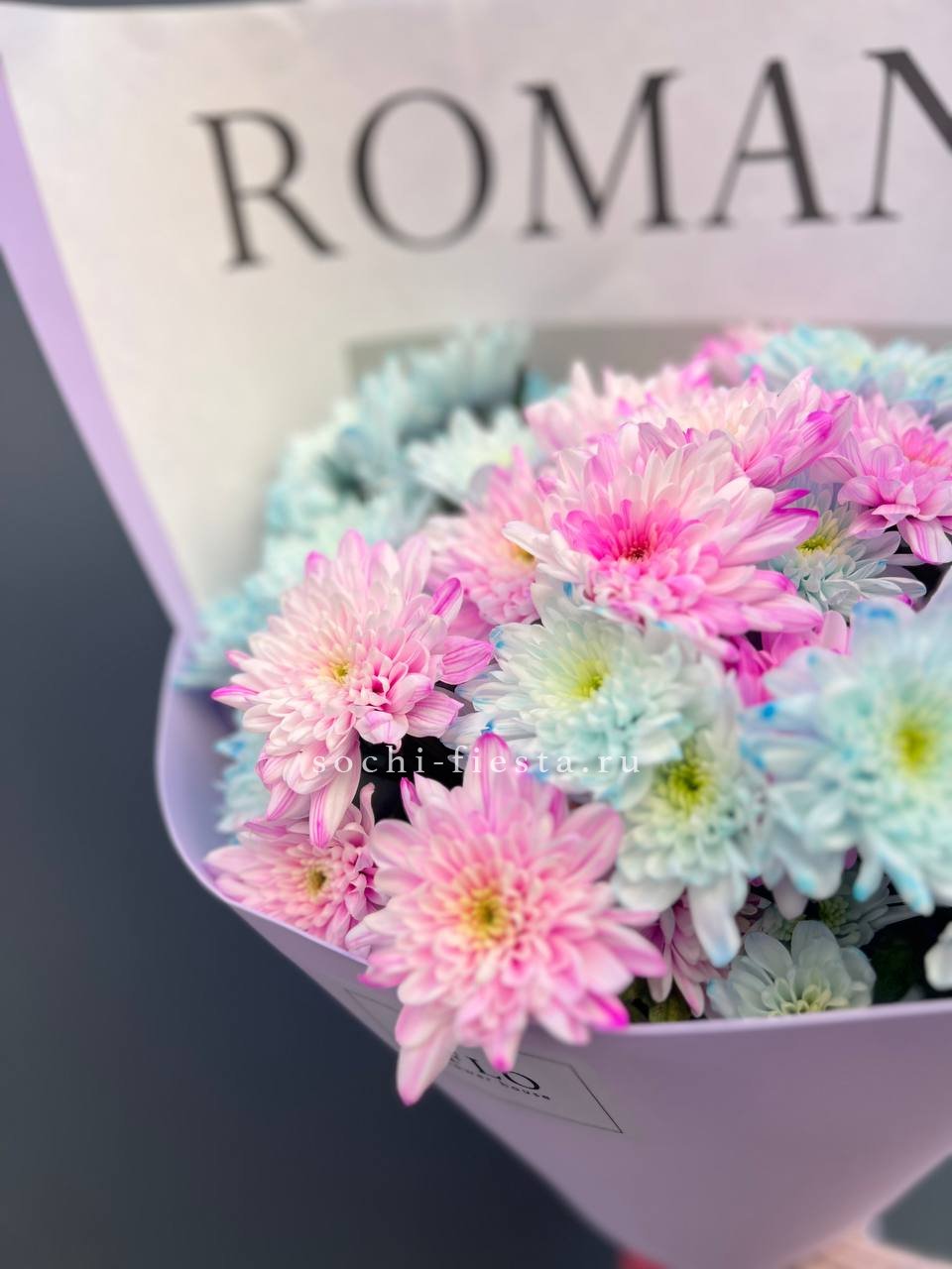 Девять веток кустовых хризантем раскрываются пышной шапкой мелких соцветий. Авторская упаковка добавляет графичности без лишних деталей. Букет держит форму и радует долгим цветением.