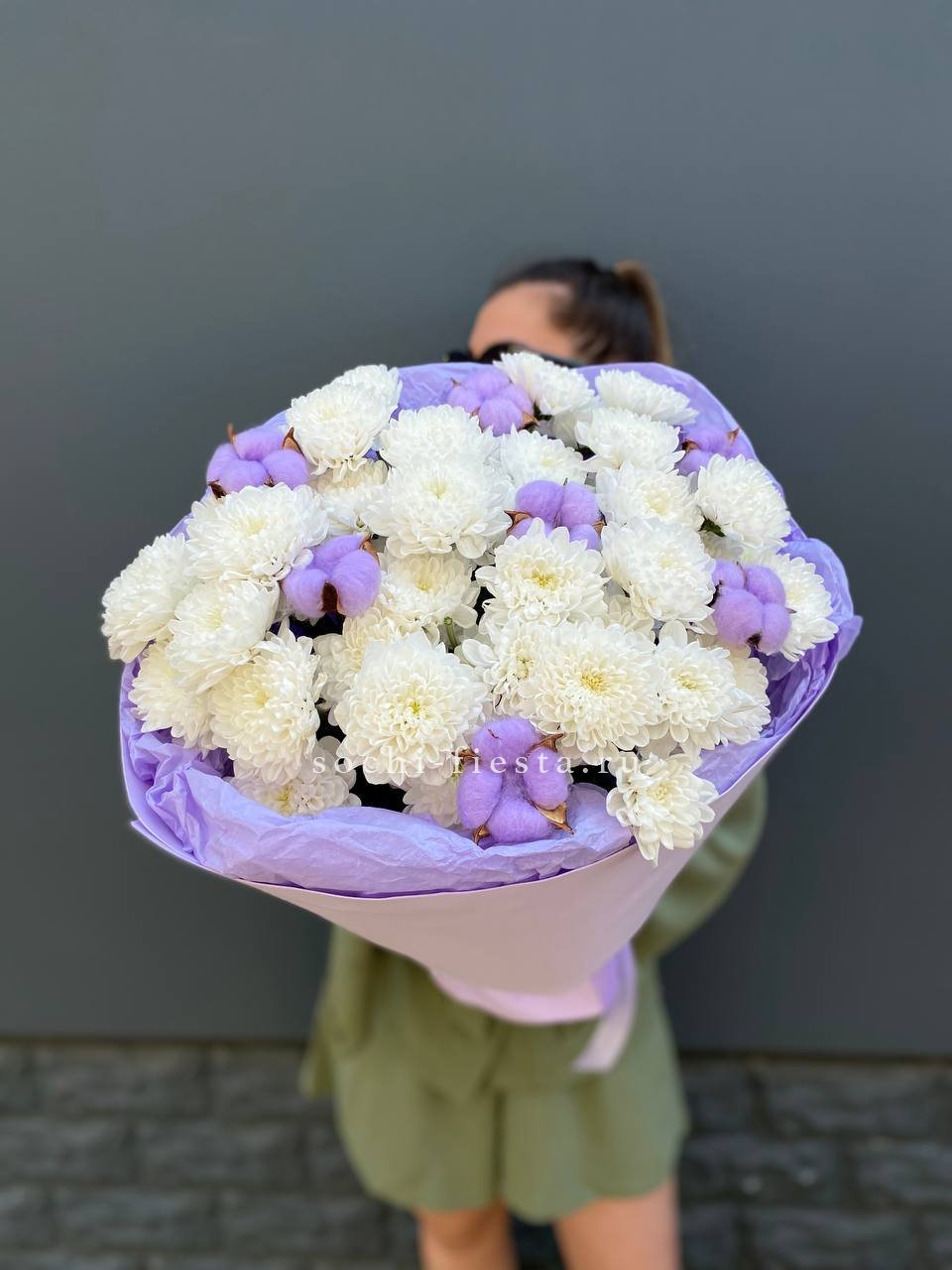 Пушистые коробочки хлопка добавляют воздушности между соцветиями хризантем. Природная фактура встречается с декоративной упаковкой в компактной форме. Букет держит объём и выглядит свежо несколько дней.