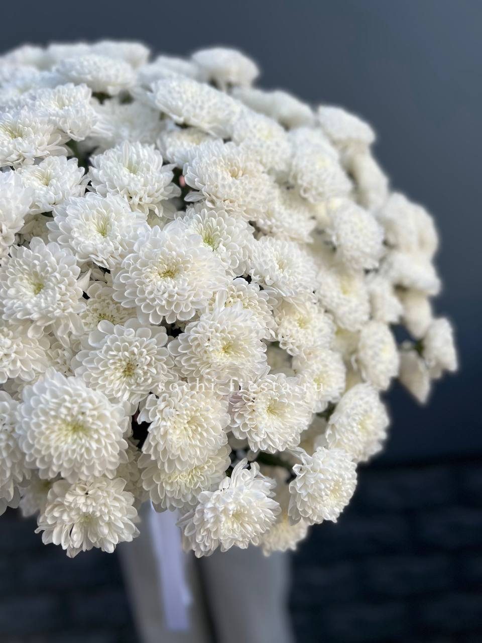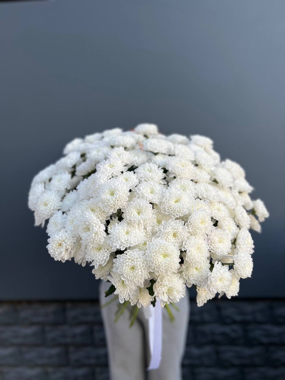 Сто одна хризантема формирует воздушное облако с мягким ритмом бутонов. Объемная композиция держит форму и наполняет пространство легким присутствием.
