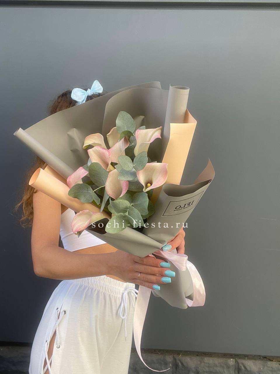 каллы - 9шт., декоративная зелень, лента.