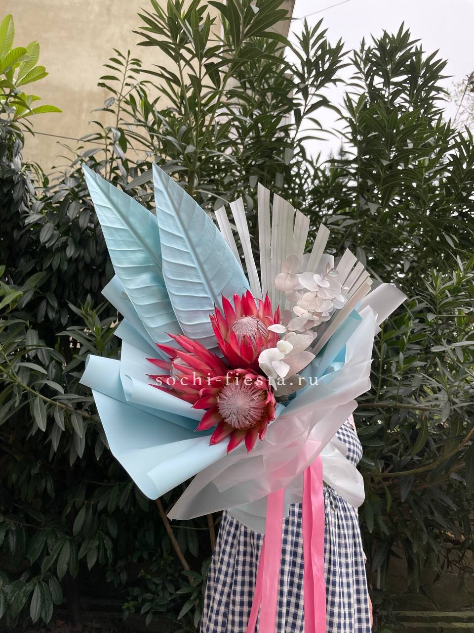 Три крупных соцветия протеи образуют графичную композицию с выраженной архитектурой. Сезонная зелень усиливает структурность линий и создаёт визуальную глубину. Букет для пространств с современной эстетикой и смелыми акцентами.