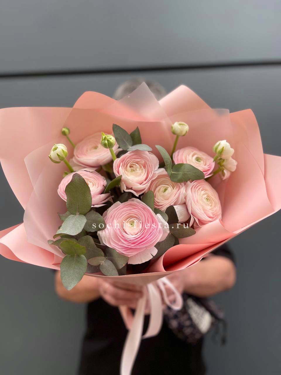 Семь ранункулюсов образуют компактный букет с мягкими переходами оттенков. Эвкалипт добавляет объём и создаёт лёгкую текстуру вокруг бутонов.