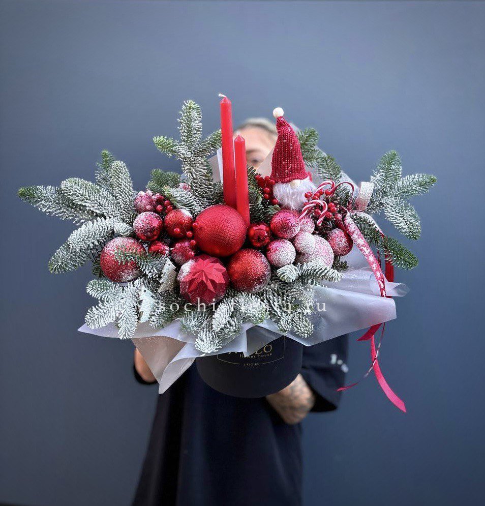 Красные акценты в игрушках и декоре задают яркий тон всей композиции. Свечи и пышная хвоя нобилиса выстраивают праздничный ритм с насыщенной цветовой подачей.