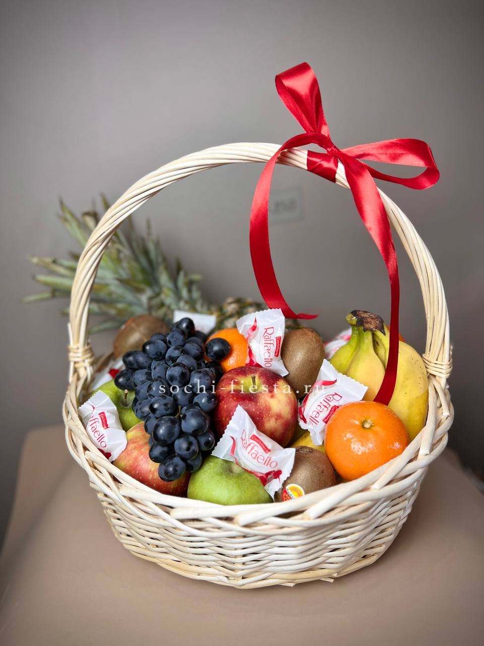 фруктовая композиция в корзине из винограда, бананов, яблок, мандарин, киви, ананаса и Raffaello. Готовая композиция может иметь незначительные внешние отличия от примера на фотографии.