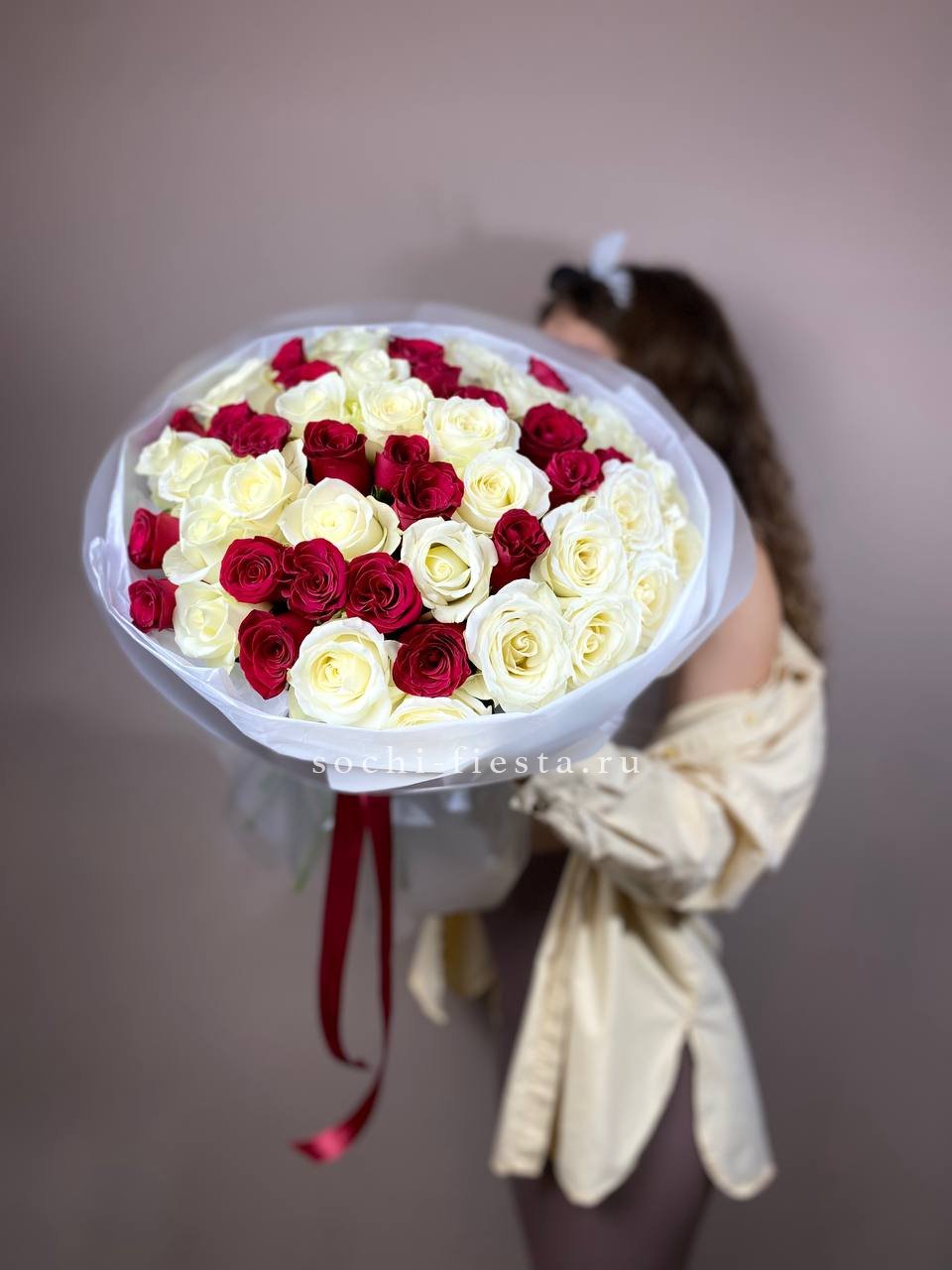 Сто одна белая роза собрана в впечатляющую охапку. Монохромная гамма и повторяющийся ритм бутонов создают мощное визуальное присутствие. Такой объём заполняет пространство и приковывает внимание.