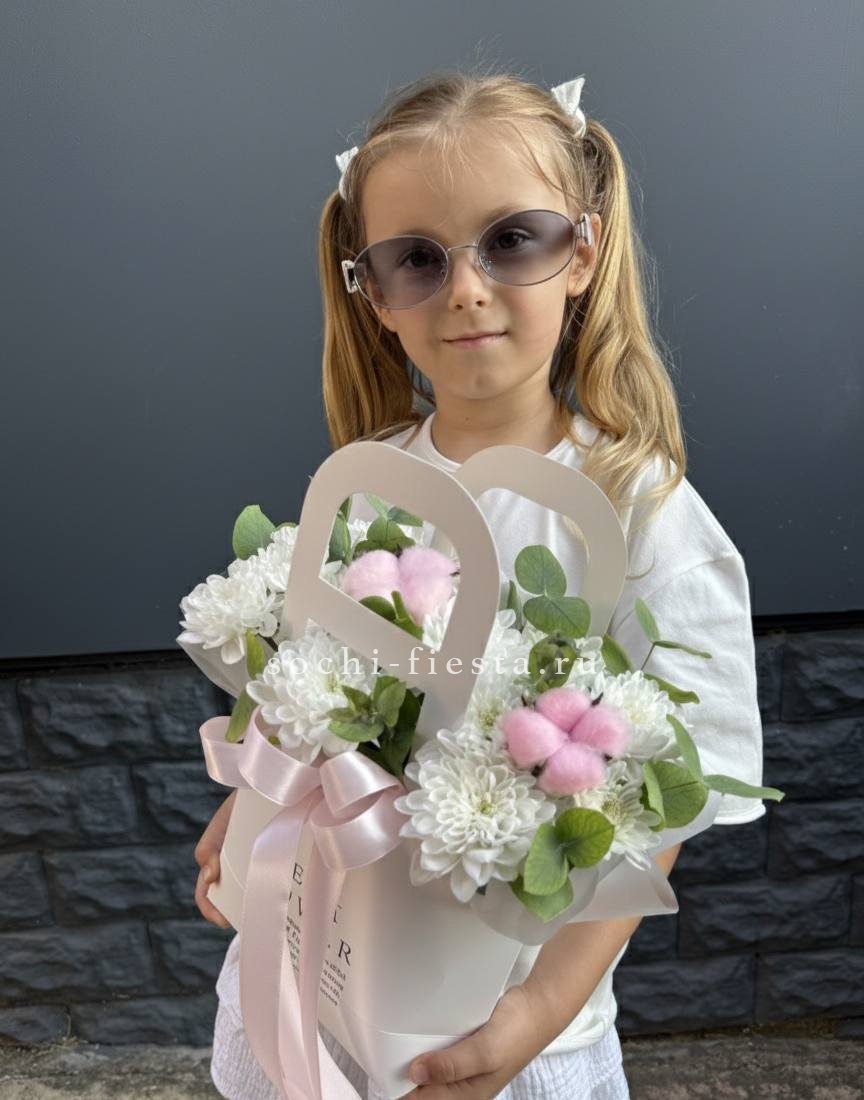 Пятнадцать белых роз собраны в аккуратную сумочку с веточками эвкалипта. Компактная форма позволяет разместить композицию на столе или полке, а матовая зелень добавляет свежести классическому белому цвету.